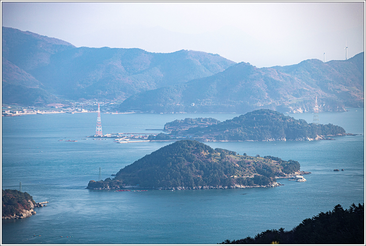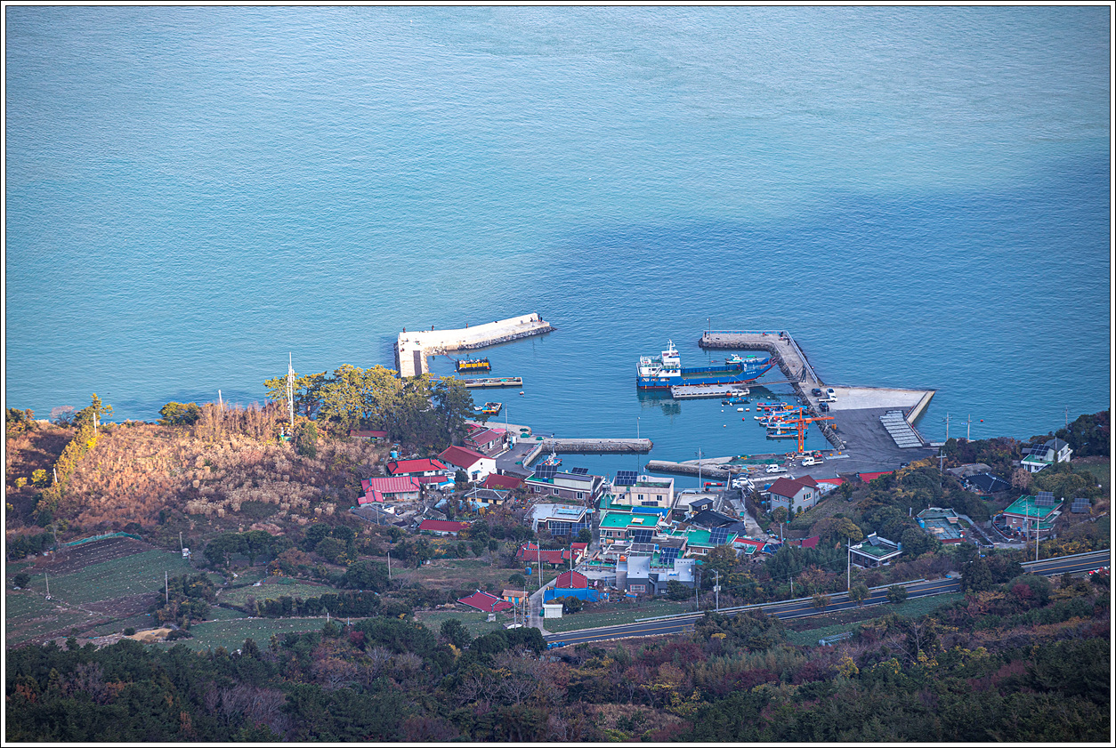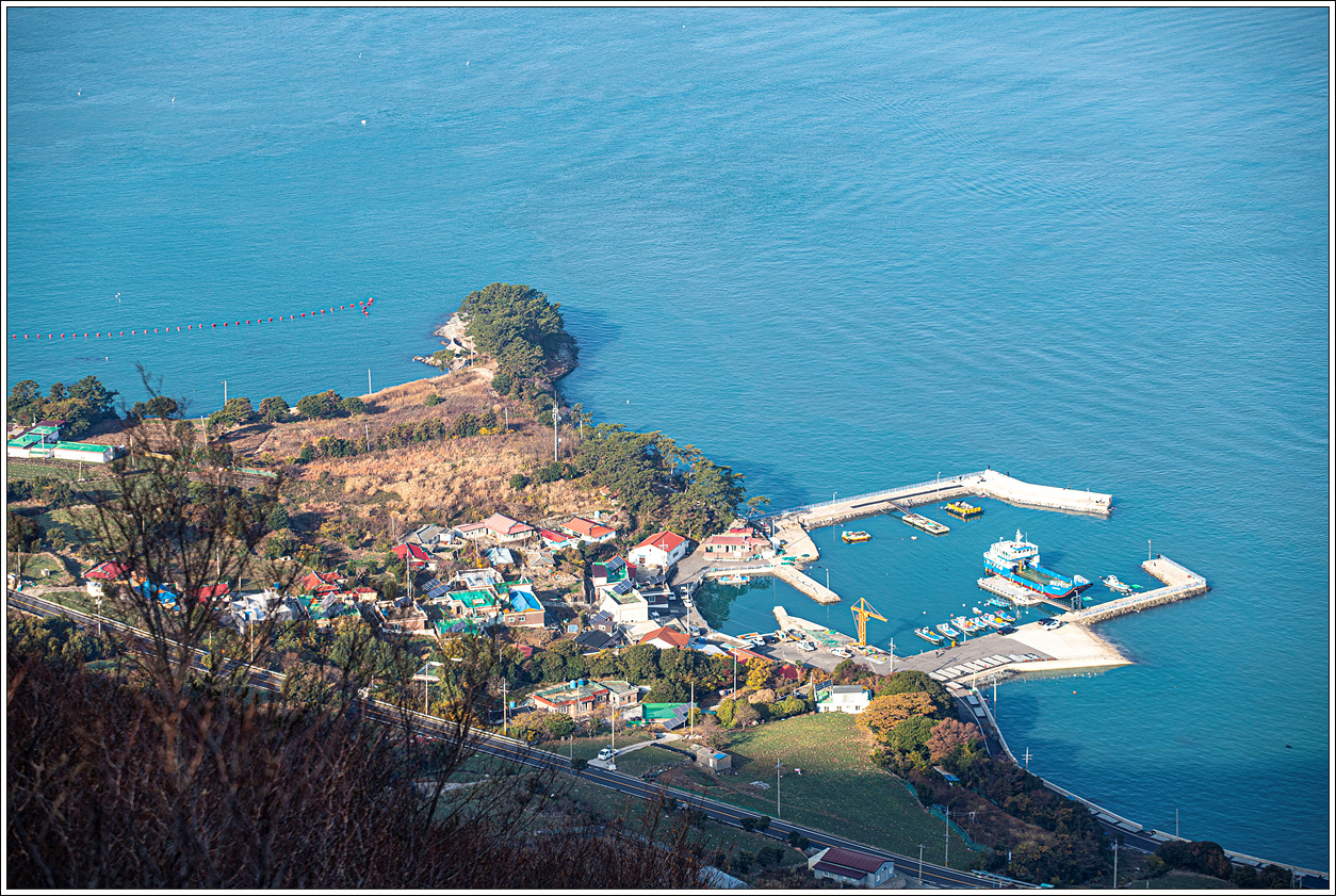 ▽ 대유마을과 오른쪽 소유마을 그리고 작은 수항도가 조망되는 가운데 멀리 돌산도의 금오산 자락도 보인다.
