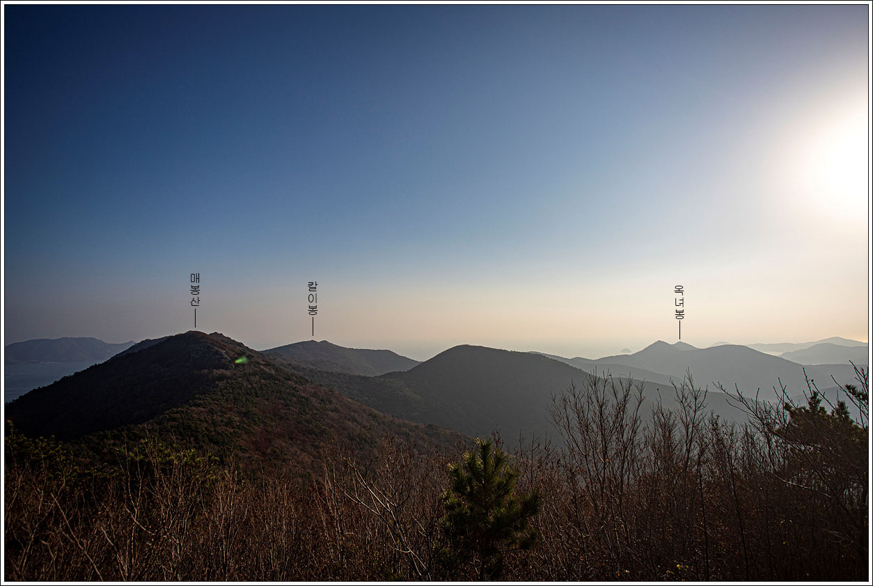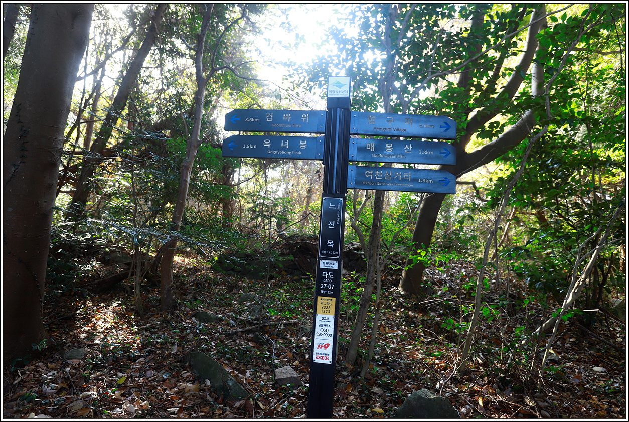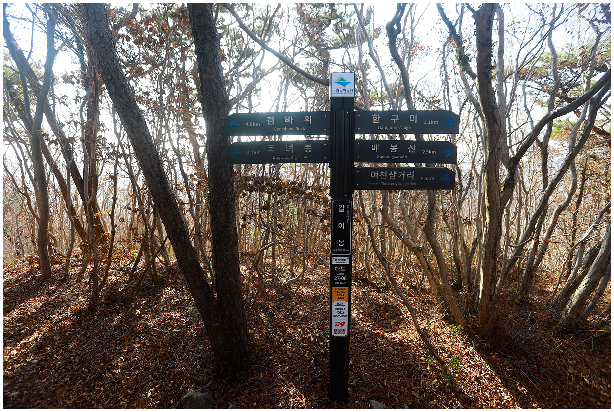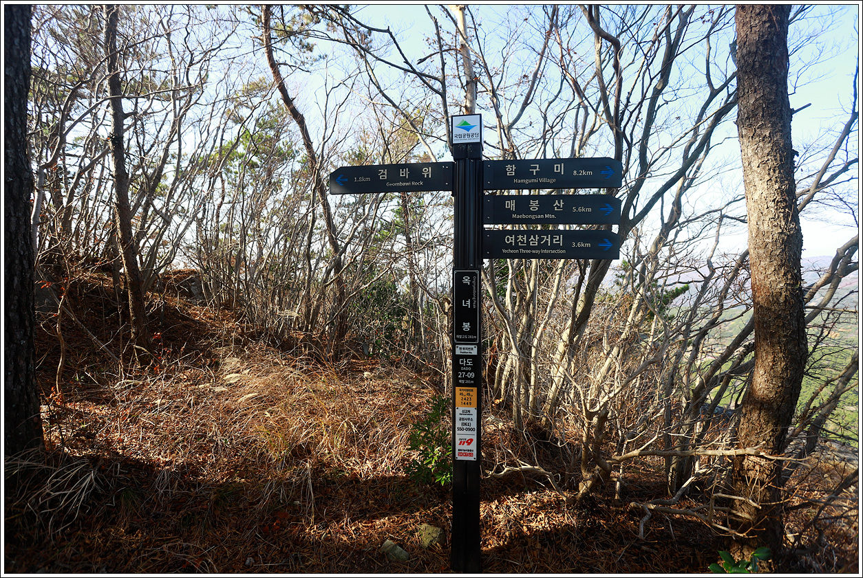 ♣ 코스: 함구미선착장-전망대-매봉산(대부산)-문바위-여천삼거리-칼이봉-느진목-옥녀봉-검바위-우실삼거리