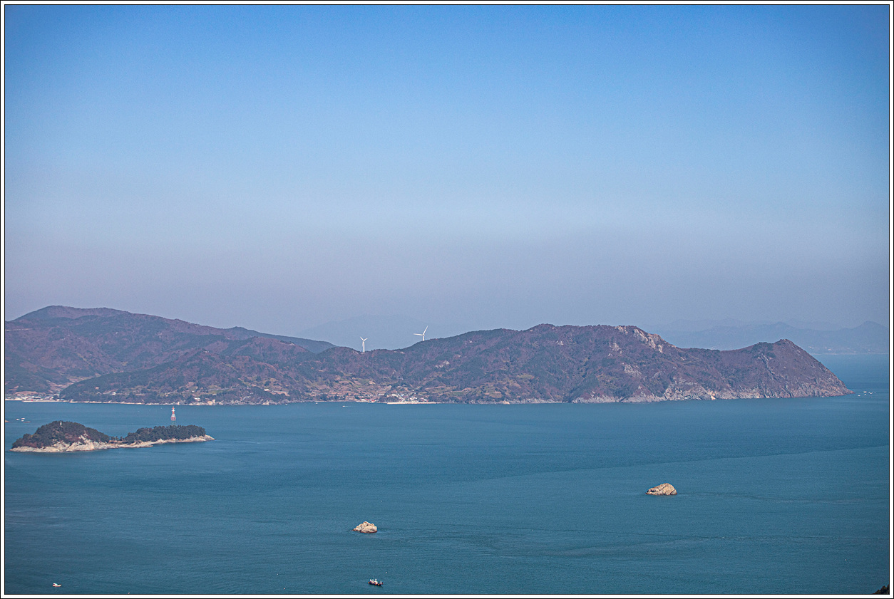 ▽ 날씨는 맑고 바람도 없는데 멀리 깨스층으로 인해 시정거리가 썩 좋지는 않다. 왼쪽 고흥의 우주발사전망대가 있는 우미산으로부터 화태도까지 섬을 살펴본다. 우미산, 개도, 낭도, 하화도, 백야도, 돌산도 등 모두 가본 곳들이니 이제 이쪽 지방은 100섬 중에 마지막 탐방인 셈이다.
