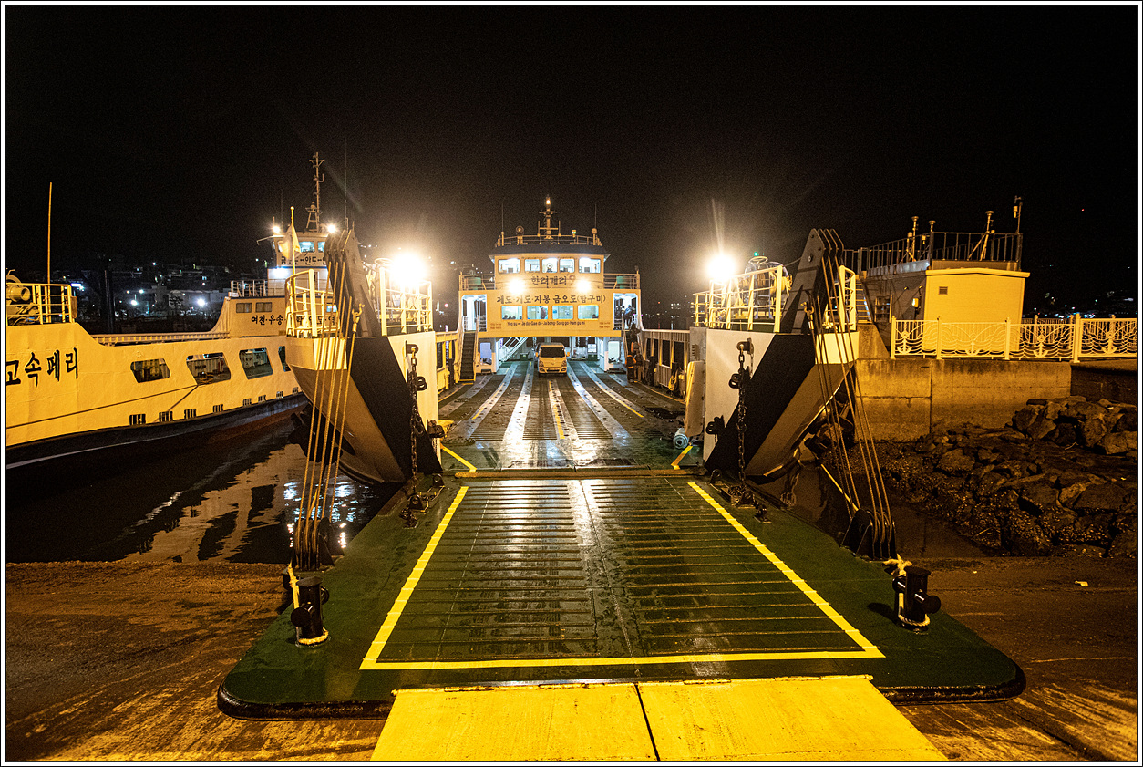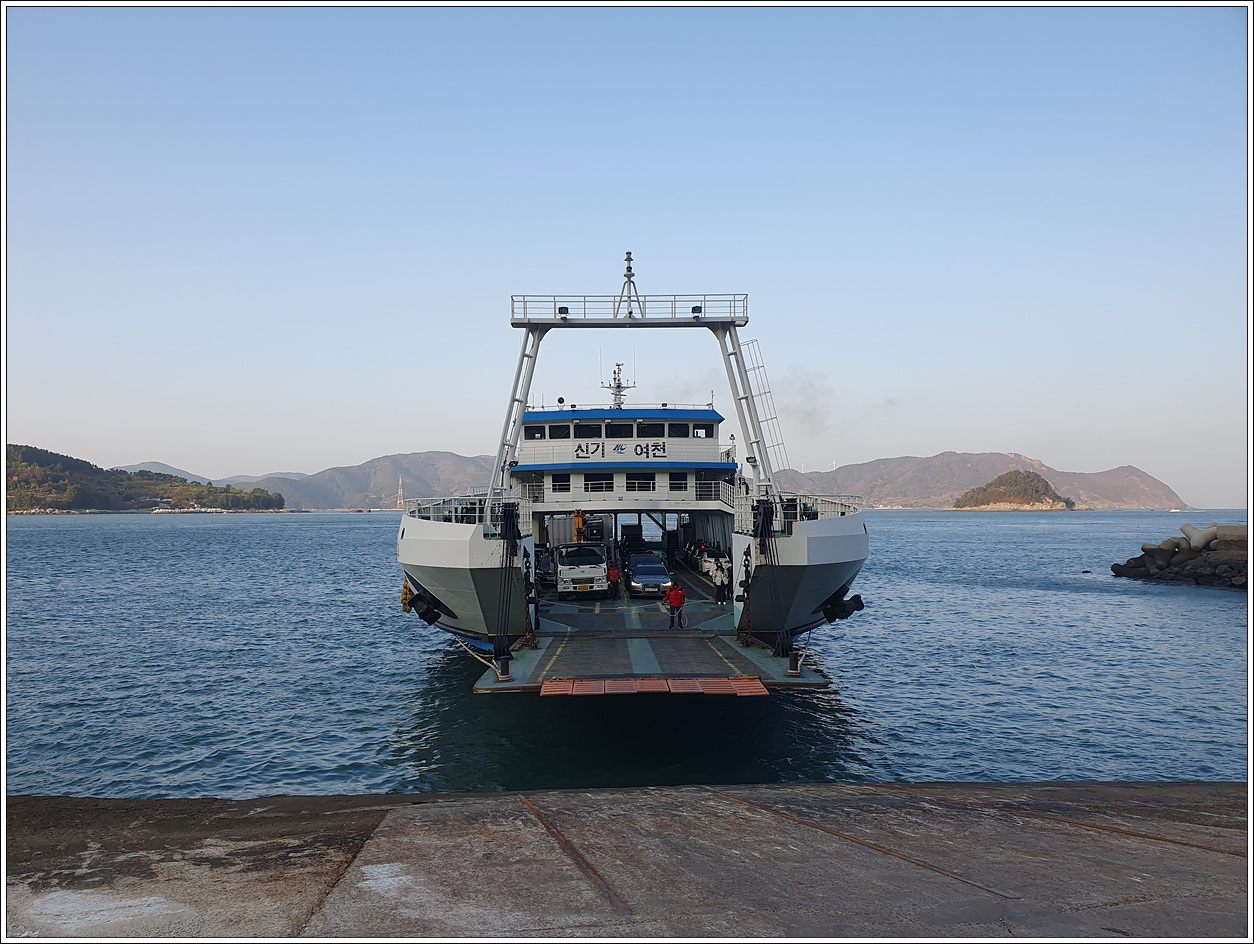 ▽ 차도선이 도착했다. 이곳에서 돌산도의 신기항까지 가는 시간은 30분밖에 걸리지 않는다. 아침에 가까운 신기항에서 함구미선착장으로 가면 될 것을 구태여 여수항에서 1시간 30분 거리를 가야 했나 의아해 했는데 나중에 알고 보니 여수항에서 이곳 여천선착장으로 오는 배는 없고 신기항에서 와야 하는데 그러면 비렁길코스와 맞질 않아 어쩔 수 없이 올 때는 여수항을 이용해야 하고 갈 때는 여천선착장이 가깝고 신기항까지 소요시간이 짧아 그렇게 배 시간을 정할 수밖에 없음을 알게 됐다.