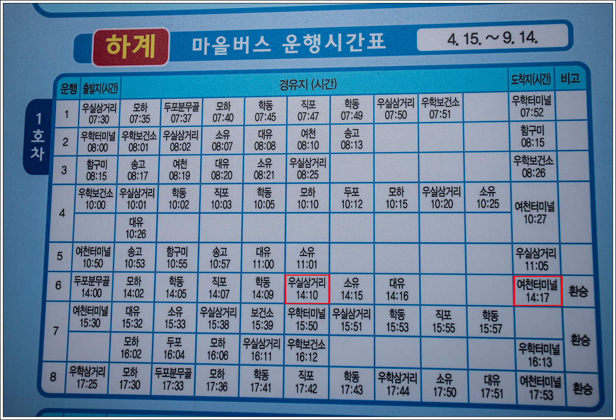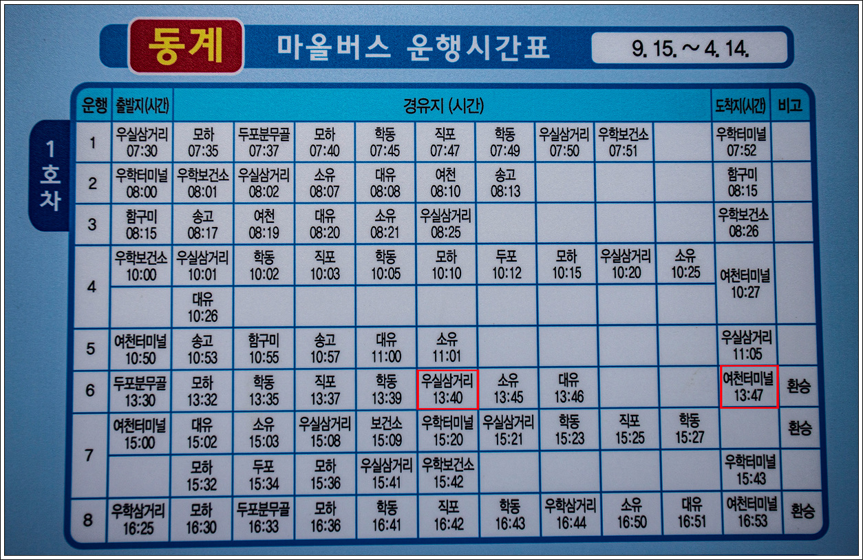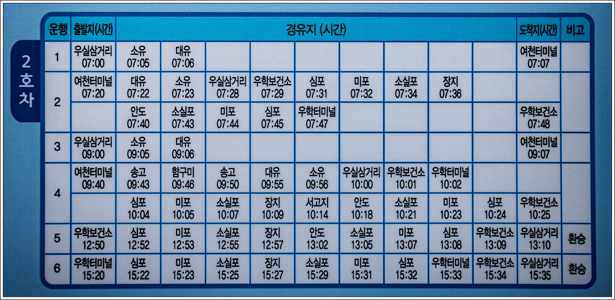 여천터미널까지 가는 것은 1호차가 13:47에 도착하는 것으로 되어 있으므로 검바위 등산로 입구까지 하산하면 가장 가까운 곳이 우실삼거리이니 실제 산행시간은 8시간이 넘지만 13:40에 버스를 타야 하므로 07:45에 산행을 시작하면 약 12km 거리를 5시간 안에 우실삼거리까지 도착을 해야 한다. 그렇지 않으면 여천터미널까지 걸어가거나 택시를 불러 탈 수밖에 없다. 그러나 5시간이면 충분히 걸을 수 있는 거리이므로 걱정할 필요는 없다. 비렁길 코스를 걷는 분들이 몇 코스까지 걷고 어디에서 버스를 타야 하는지 더 머리가 복잡해지는 이유이기도 하다.