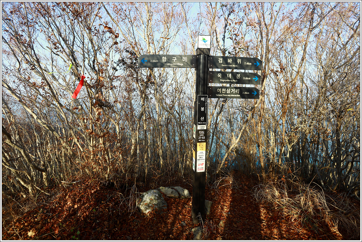 ▽ 이곳에서 매봉산은 1.2km, 검바위 등산로 입구까지는 8.6km라는 이정표가 나온다. 1.8km를 오는데 40분이 걸렸다.