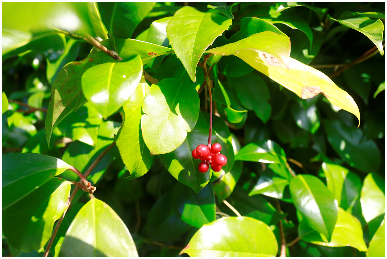 ▽ 길옆에 빨간 열매가 달려 있는 식물이 무엇인가 살펴봐도 잘 모르겠다. 동백나무와 같이 잎에 광택이 나는데 열매는 오미자와 같이 생겼는데 오미자가 열릴 시기가 아니고 오미자는 많이 보아왔던 터라 알송달송 궁금하여 후에 살펴 보니 처음 보는 <남오미자>이다. 역시 남쪽 섬에 와야 볼 수 있는 식물인데 식물 공부에도 취미가 있는 나로서는 반가운 일이다.