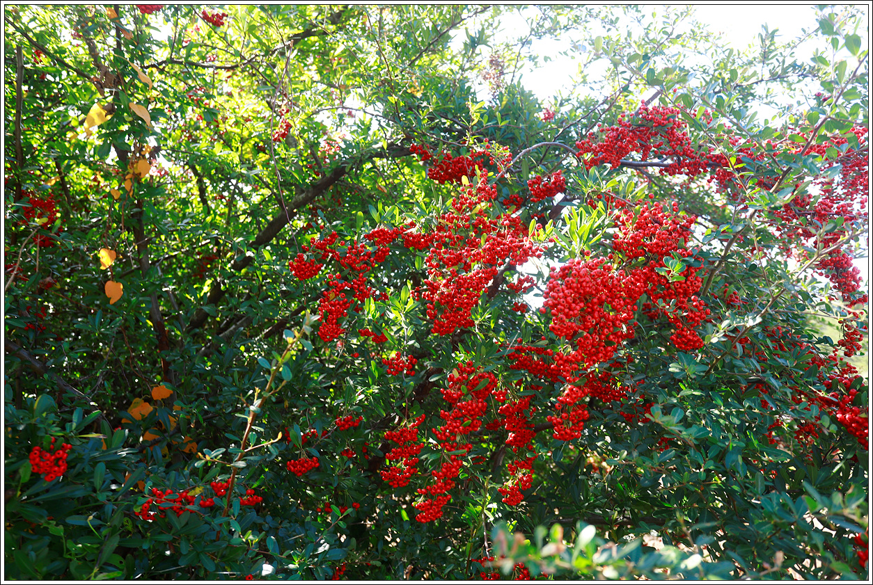 ▽ 피라칸다 ( 학명: Pyracantha angustifolia) 열매가 삭막한 늦가을에 보기 좋게 열려 눈길이 간다. 과거에 남부지방서 주로 볼 수 있는 나무였으나 지금은 기후 변화로 중부지방에서 아파트나 길가의 화단에 조경용으로 식재되어 흔히 볼 수 있는 열매이기도 하다.