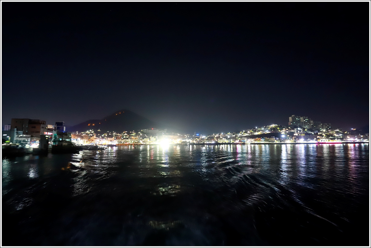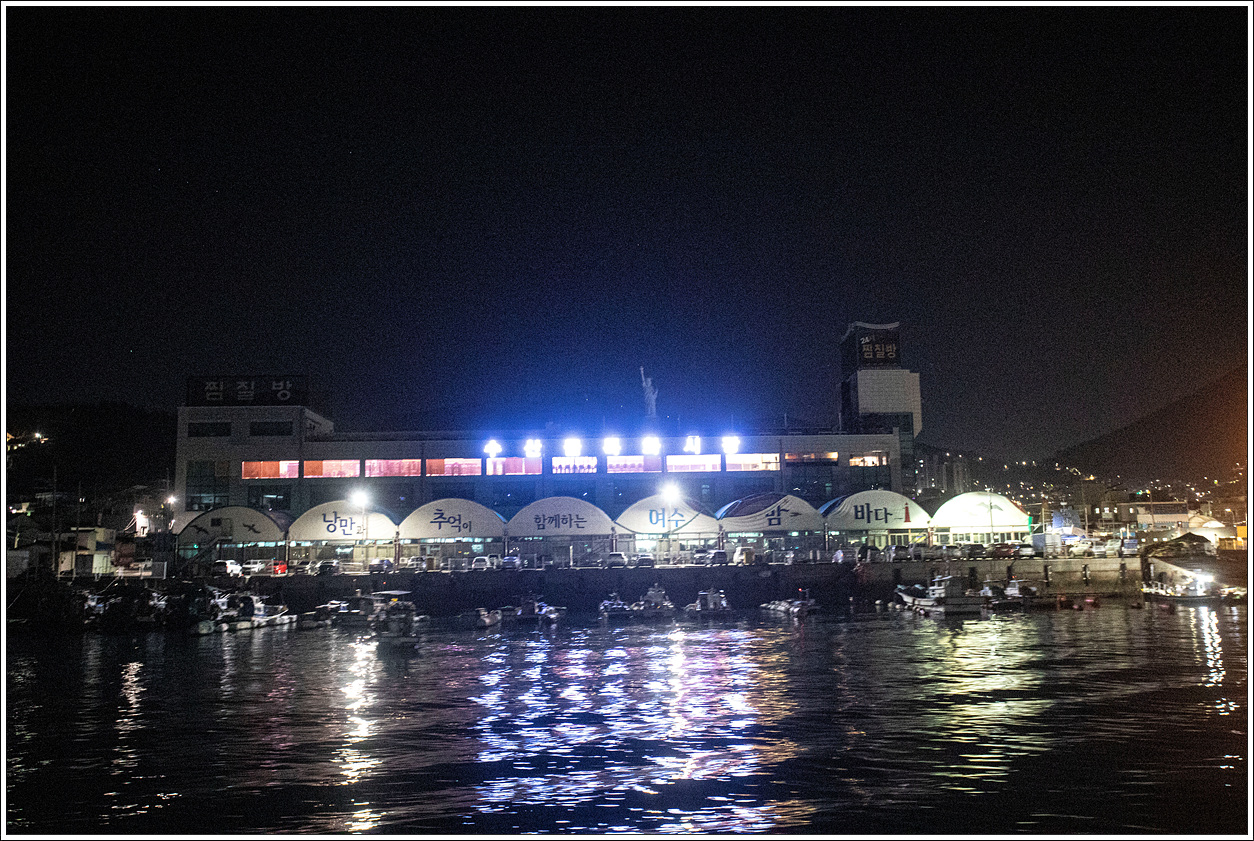 ▽ 차도선이 출항하면서 담아 본 수산물 특화시장의 야경으로 낭만과 추억이 함께하는 여수 밤바다의 글귀를 보노라니 장범준이 부른 <여수 밤바다> 노래가 귓전에 맴돈다.