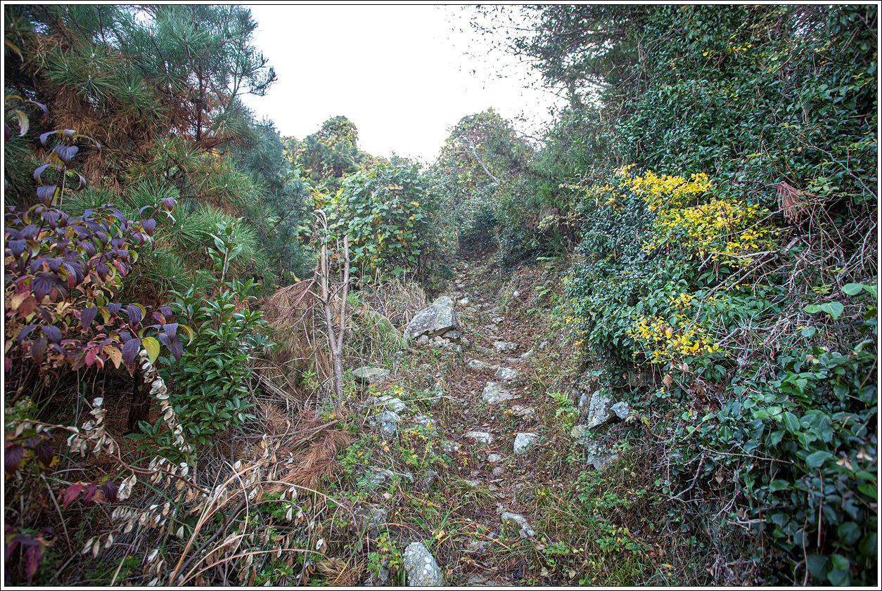 ▽ 이제부터 본격적인 동백나무가 빼곡히 숲을 이룬 상록수림이 시작된다. 그동안 많은 산과 섬을 다녀봤지만 이렇게 울창하고 넓은 군락지를 형성한 상록수림도 많지 않다. 한 여름 숲을 방불케 하는 상록수림을 걷노라니 별 세상에 온 느낌이다.
