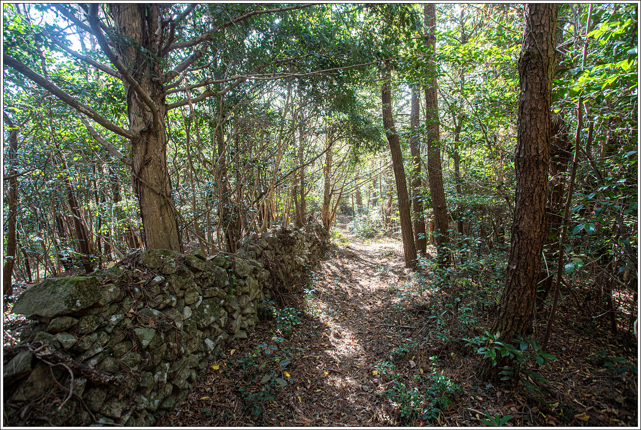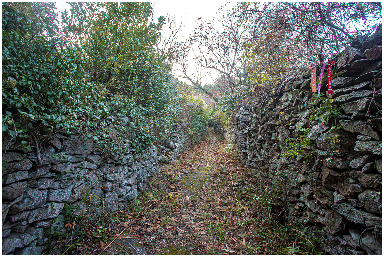 ▽ 조금 올라가니 고령의 동백나무가 길가의 돌담과 함께 숲을 이뤄서 겨울이 다가오는 계절임을 느낄 수 없다.