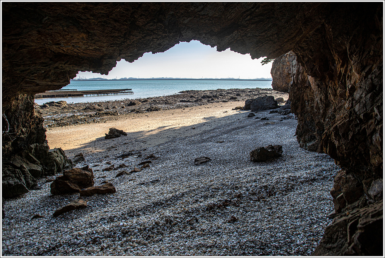 ▽ 해변에 깍인 바위가 한여름 때양볕 그늘막이 되어 줄 것도 같고 소낙비도 피할만 하게 지붕을 이뤘다.