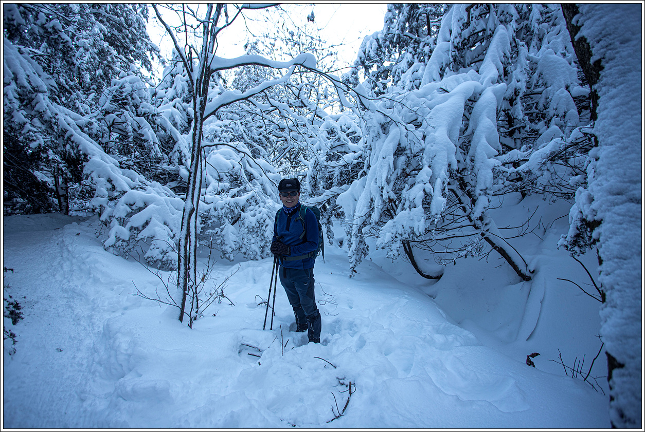 ▽ 계곡길은 능선과 달리 눈이 덜 녹았고 나뭇가지의 눈도 바람의 영향이 없어 쌓인 그대로 눈 내린지 얼마되지 않은 것 같은 모습이다.