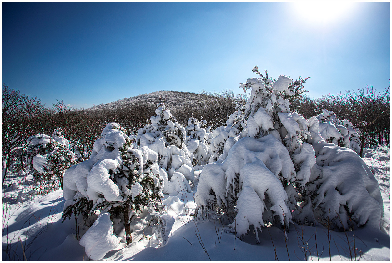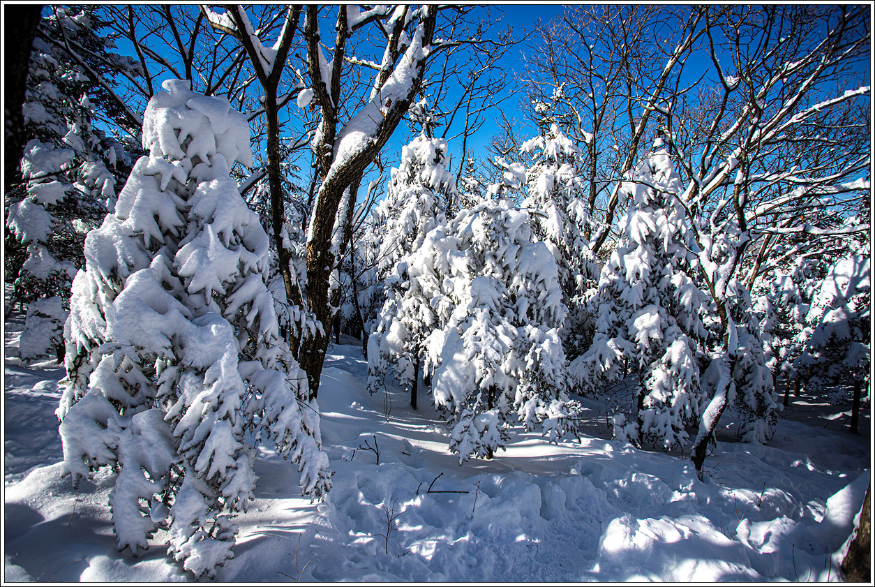 ▽ 눈을 뒤집어 쓴 나무들이 제각기 작품을 만들어 낸다.