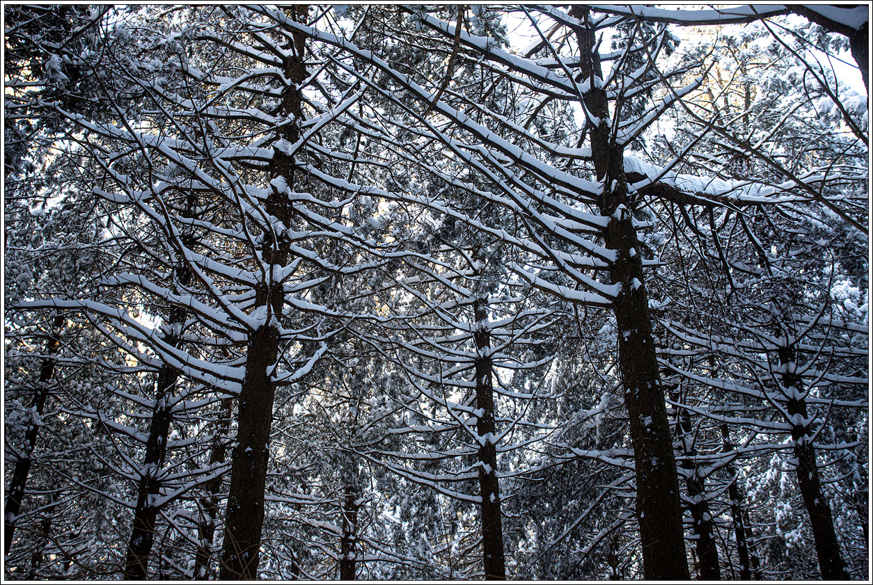 ▽ 꼿꼿하게 서 있던 상록수가 습설에 견디지 못하고 모두 고개를 숙이고 있는 모습이 모두 손을 모으고 잘 가시라고 인사를 건네는 것 같아 슬며시 미소를 지어본다.