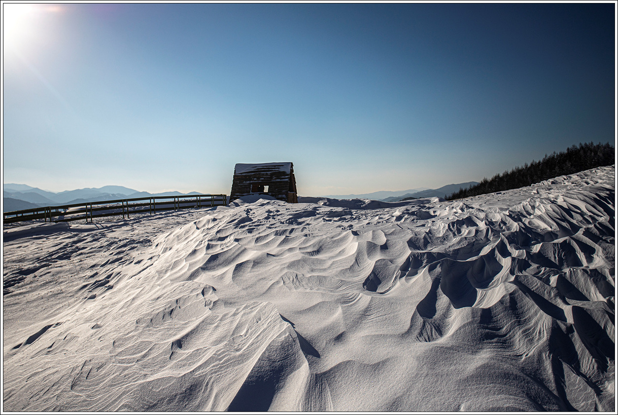 ▽ 이제 대관령양떼목장 울타리쯤 왔으니 날머리까지는 얼마 남지 않은 것 같다. 바람결에 파인 눈이 마치 사막의 느낌마저 주고 있다.
