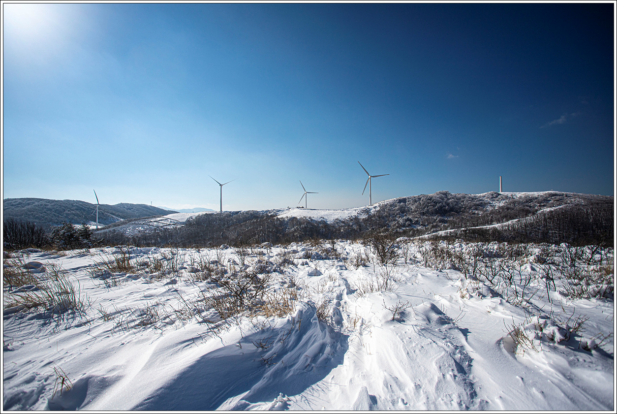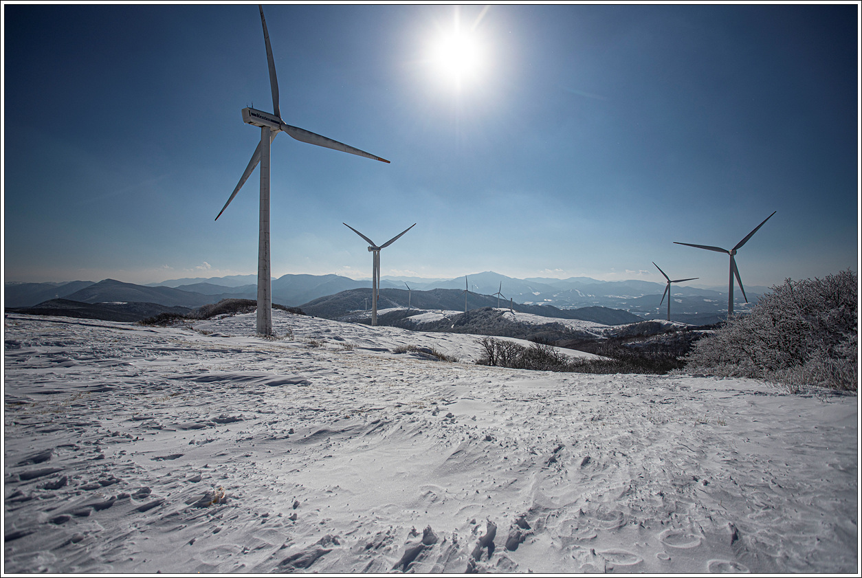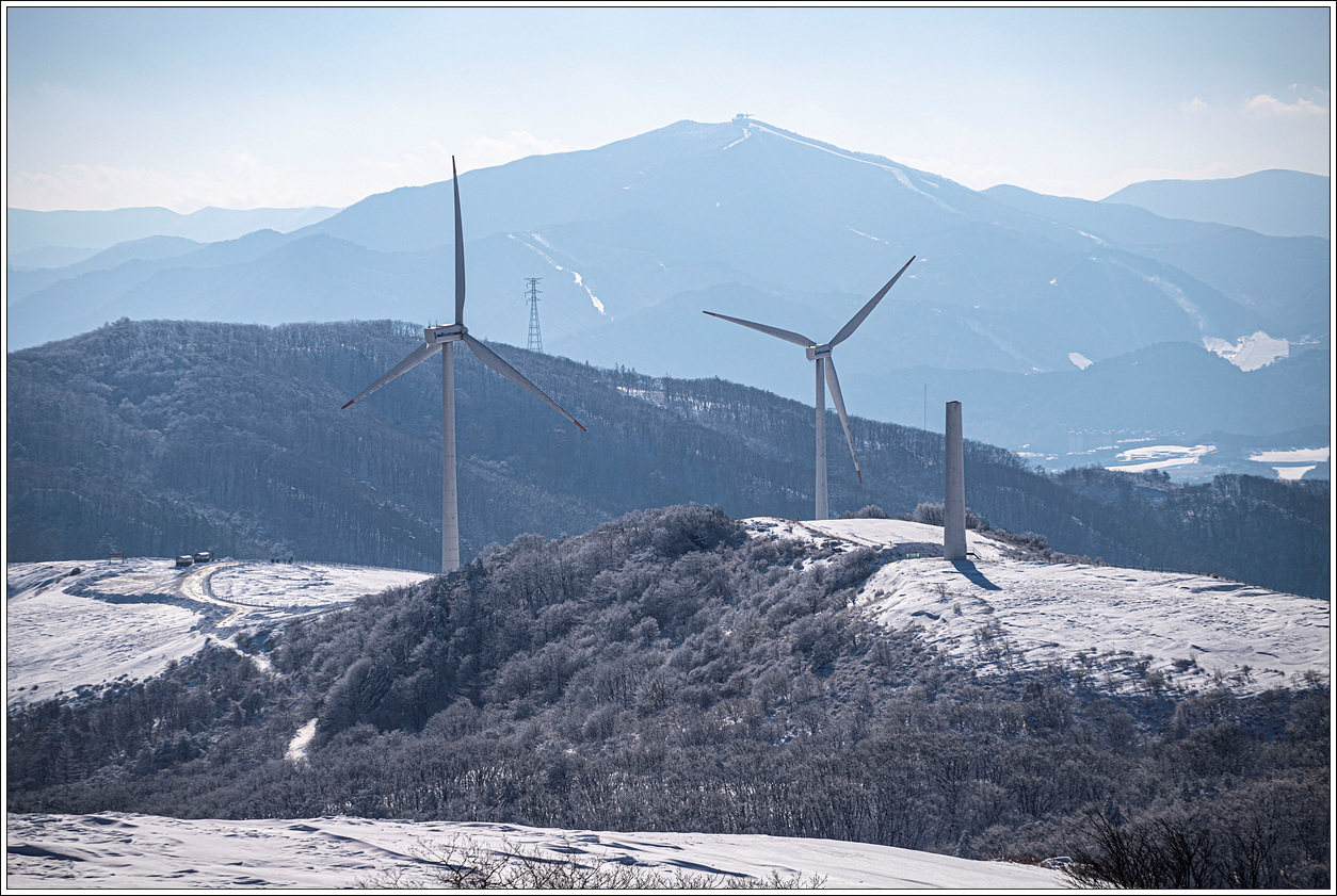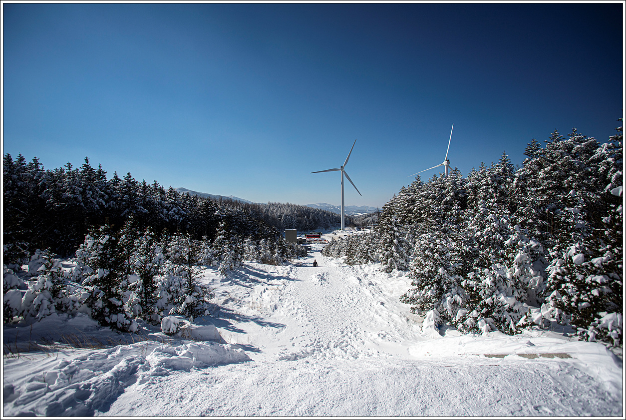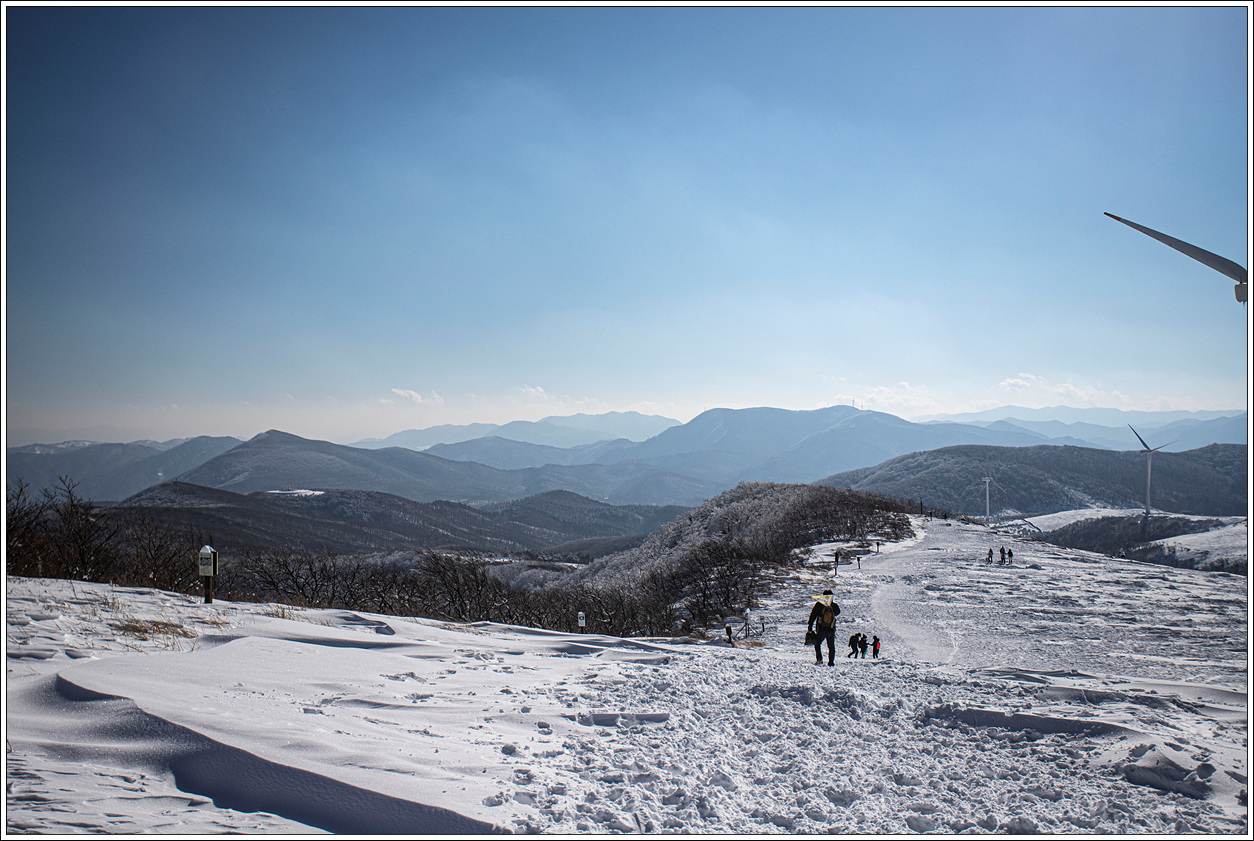 ▽ 풍력발전기가 있는 능선까지 왔다. 마치 스키장 슬로프가 생각나게 하는 넓고 경사도가 있는 능선으로 저 위쪽에는 비닐을 휴대하거나 플라스틱용기로 된 눈썰매를 타고 내려 오는 사람들이 눈에 뜨인다.