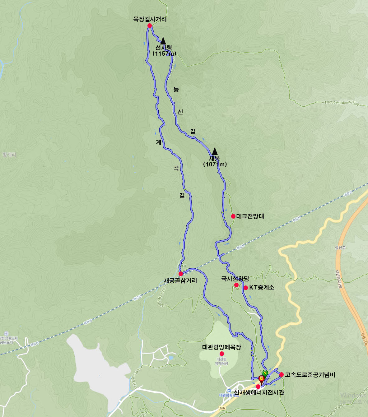 ♣ 트레킹코스: 신재생에너지전시관-KT중계소-새봉-선자령-목장길사거리-계곡길-재궁골삼거리-양떼목장울타리-신재생에너지전시관