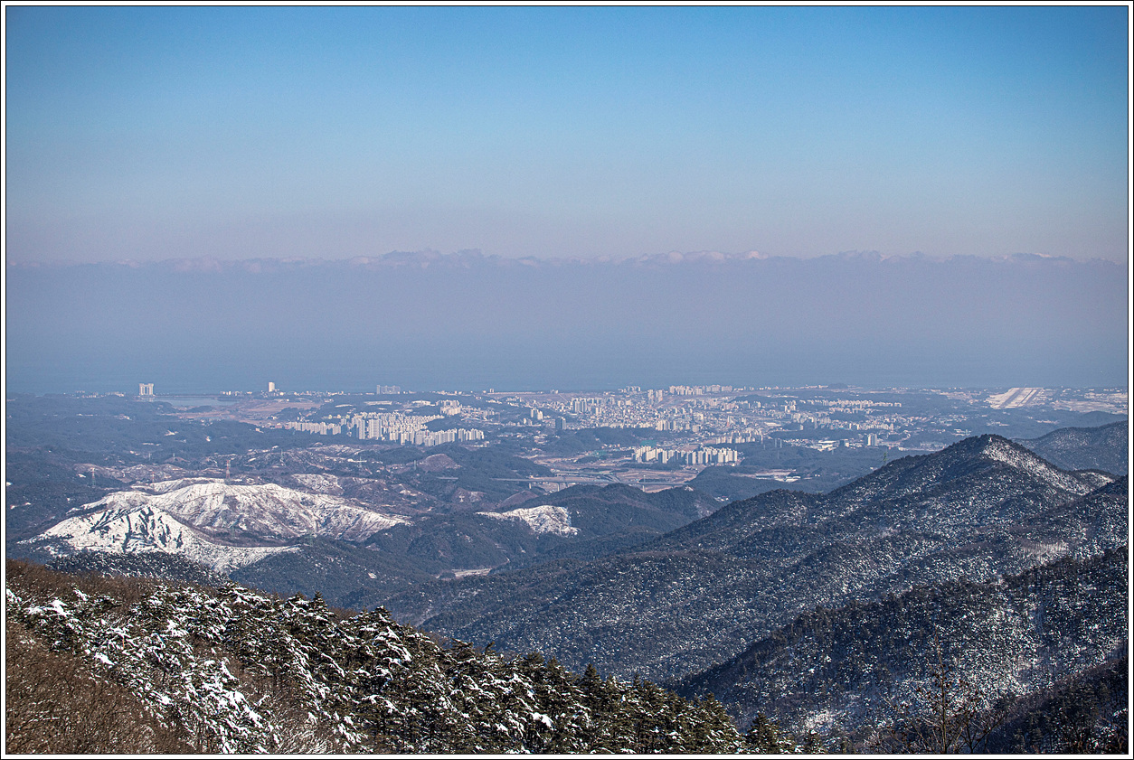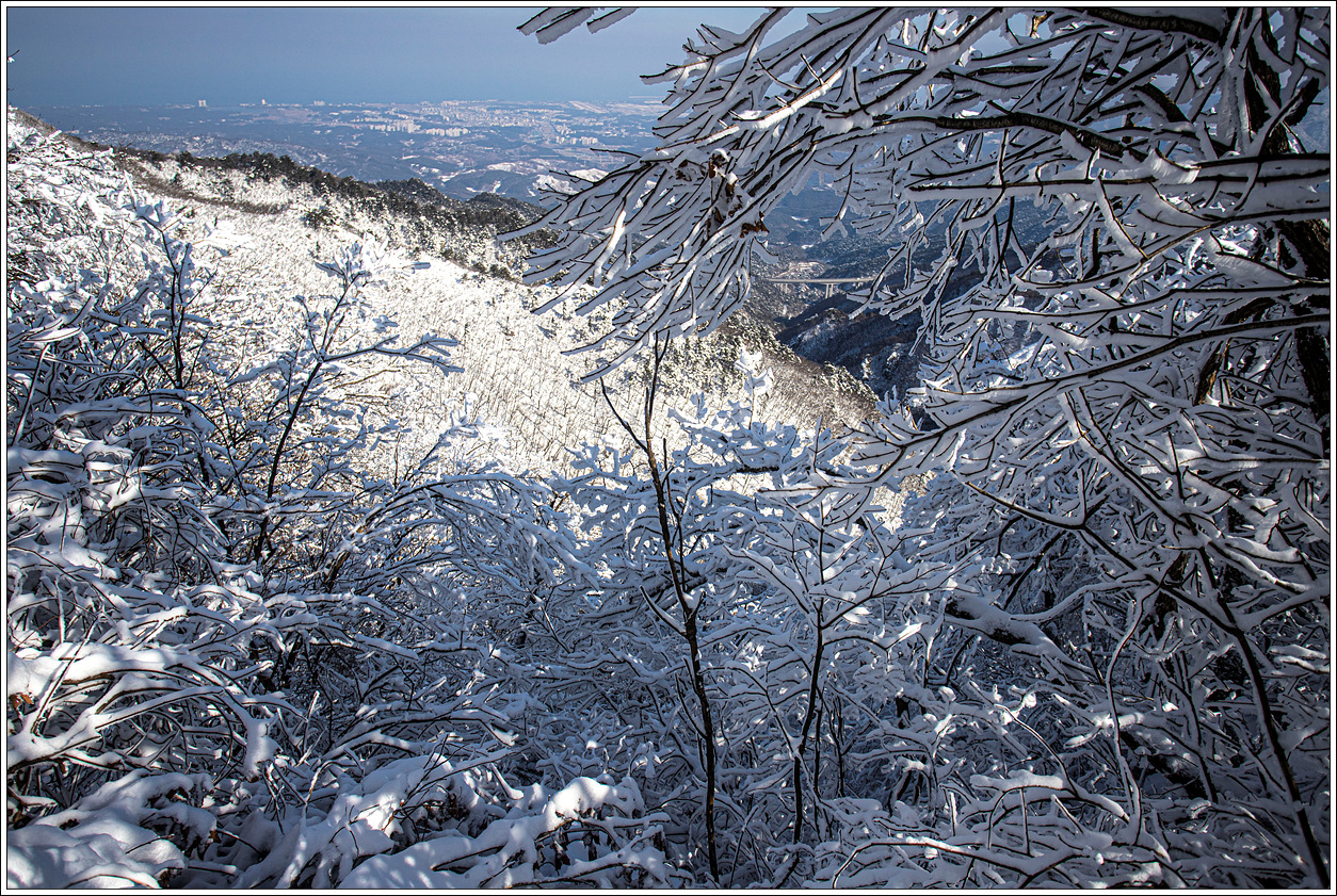 ▽ 능선 오른쪽 계곡으로 바라 보니 멀리 강릉시가 보이고 이쪽 계곡은 상고대로 온통 하얀 세상이다. 눈꽃은 눈이 내려 가지마다 쌓인 상태지만 상고대는 눈꽃과 달리 공기중의 습기가 영하의 기온으로 나뭇가지에 얼어 붙어 생긴 현상으로 더욱 아름다운 풍경을 자아낸다.