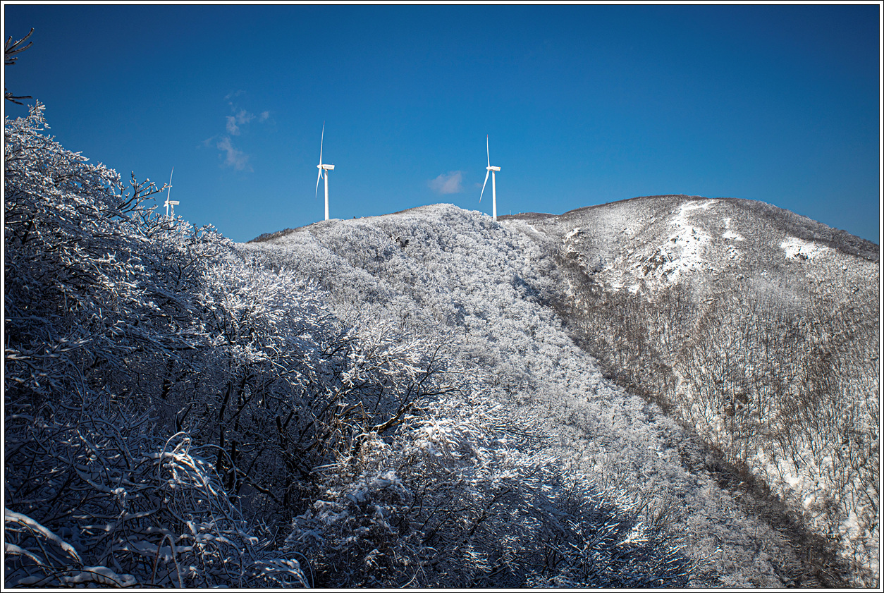 ▽ 오른쪽으로 곤신봉(1135.2m)이 능선따라 세워진 풍력발전기와 함께 눈앞에 펼쳐진다.