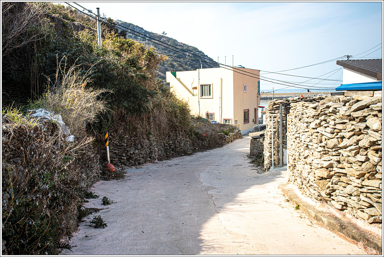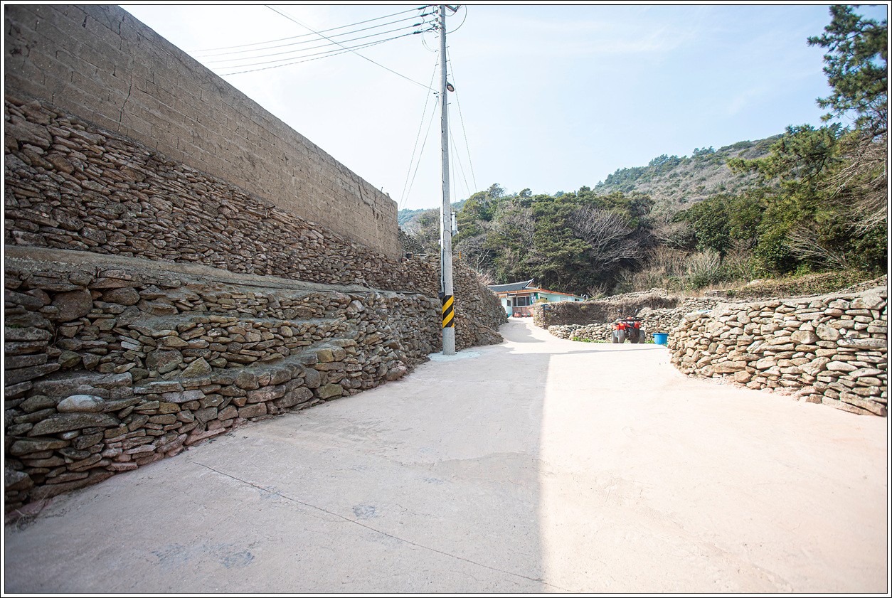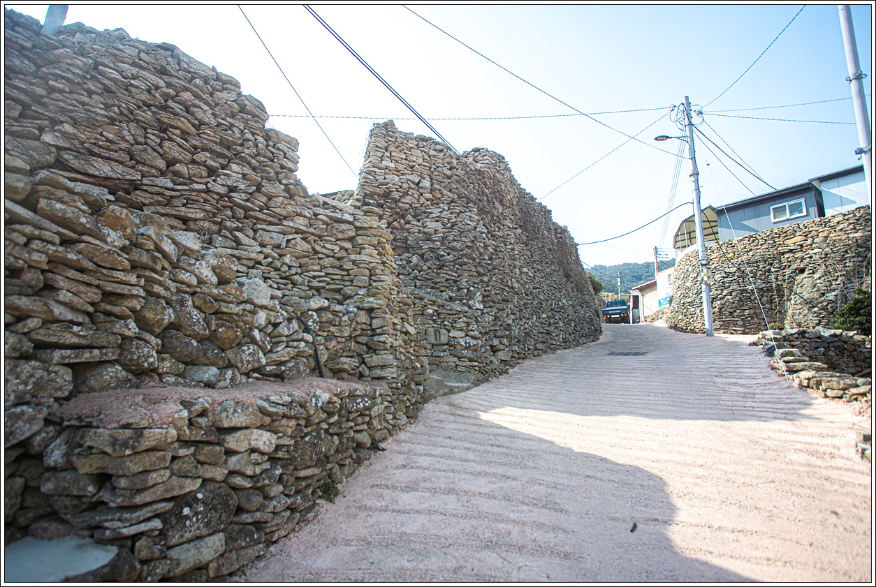▽ 남해안 쪽의 섬들일 수록 해풍의 피해를 입지 않기 위해서 돌담을 쌓은 마을이 많은데 이와같이 지붕을 가릴 정도로 높이 쌓는 경우도 드물다.