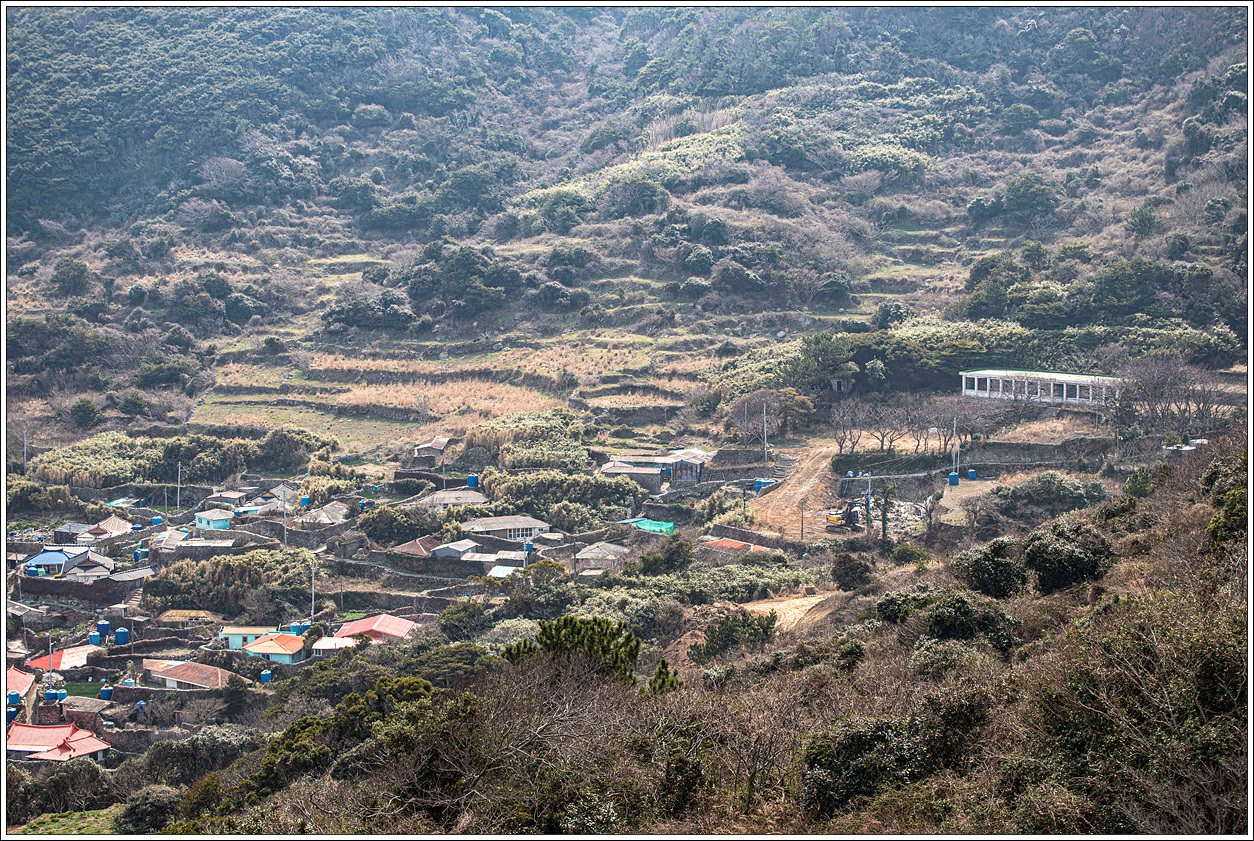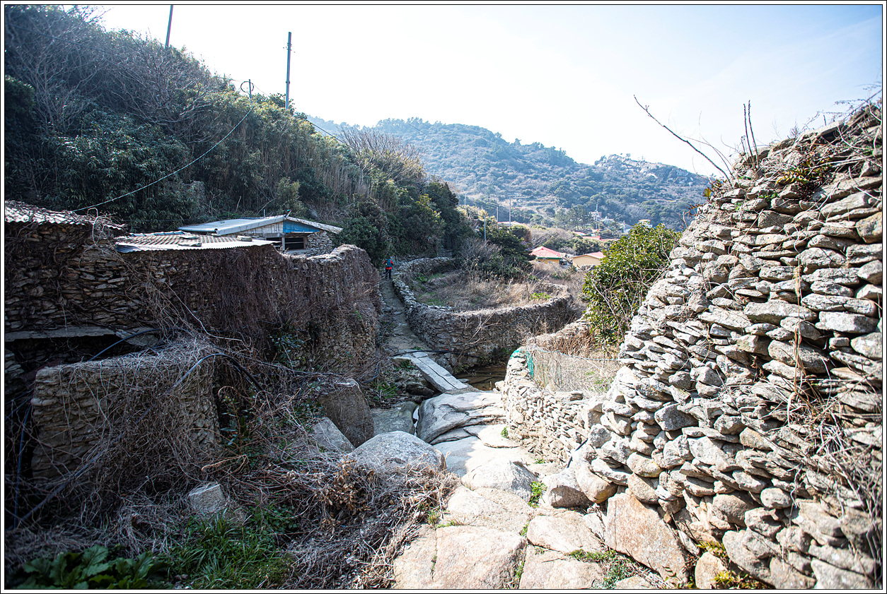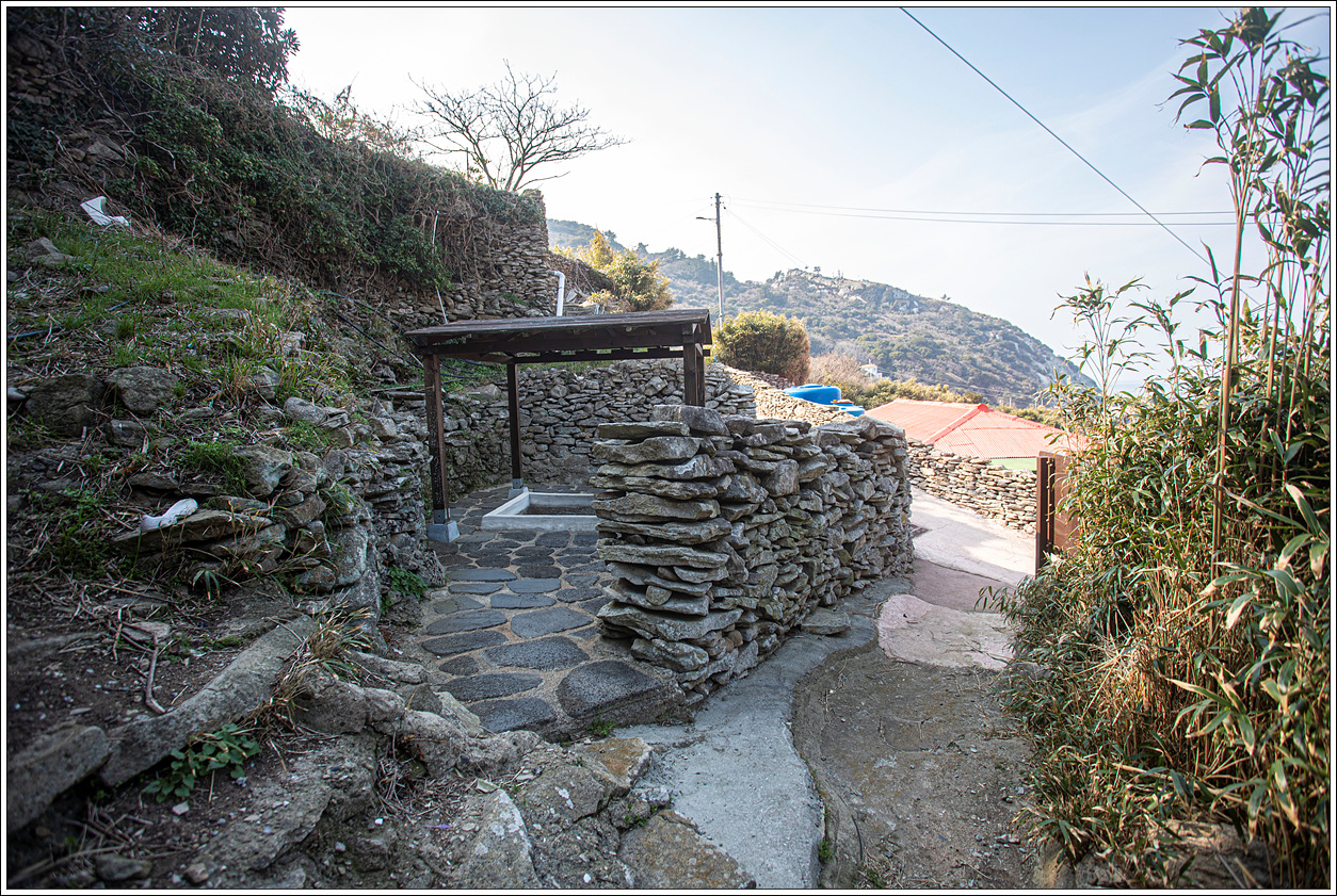 ▽ 남해안 쪽의 섬들일 수록 해풍의 피해를 입지 않기 위해서 돌담을 쌓은 마을이 많은데 이와같이 지붕을 가릴 정도로 높이 쌓는 경우도 드물다.