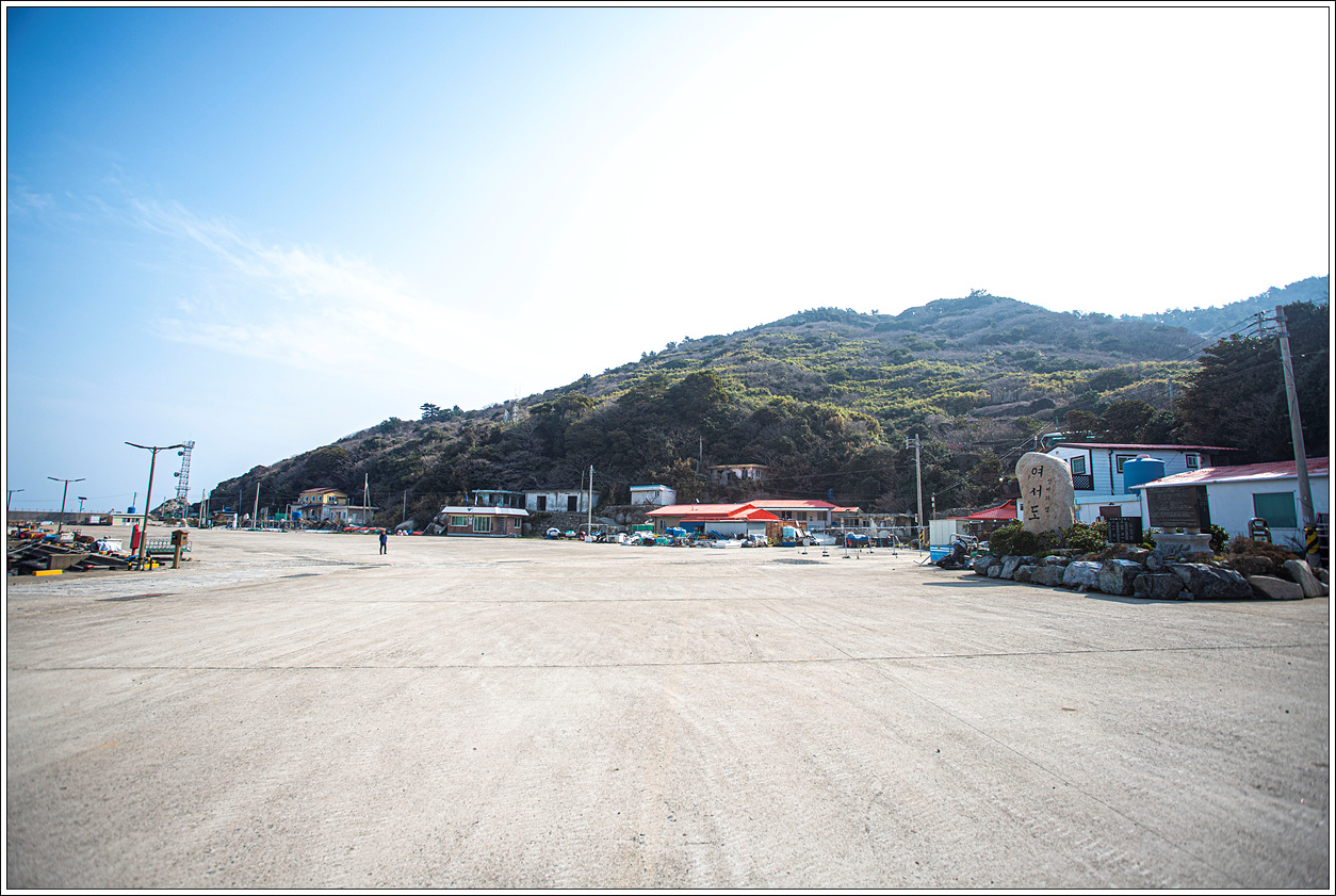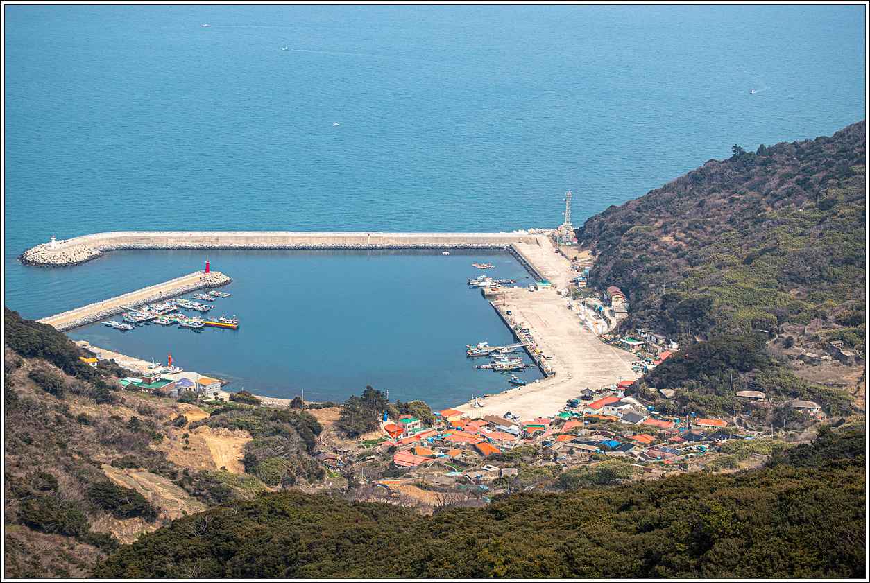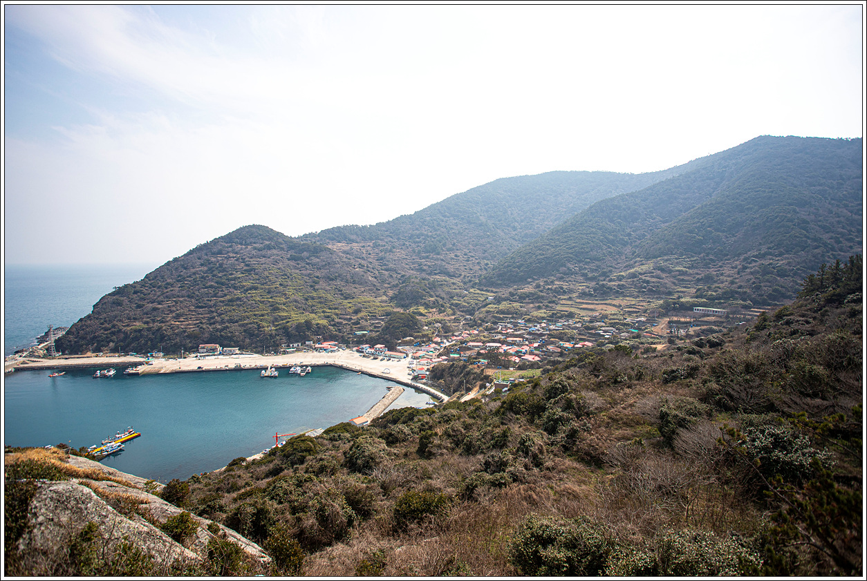 ▽ 점심시간은 11:30분으로 되어 있으니 한시간 반의 자유시간을 이용, 먼저 방파제로 나와 여호산과 마을 전경을 담아 본다. 날씨는 좋으나 미세먼지가 좀 끼었다.