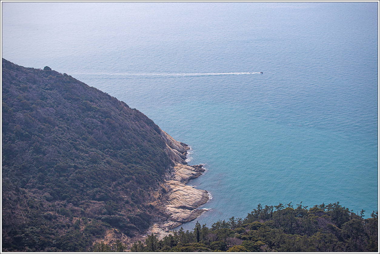 ▽ 바위가 하나 있는 전망대에 올라서 동쪽을 바라보니 역시 망망대해이고 두시간 전에 북쪽에 있던 배가 동쪽에 있는 것을 보니 순시선인 것 같은 함정이 작게 보인다.