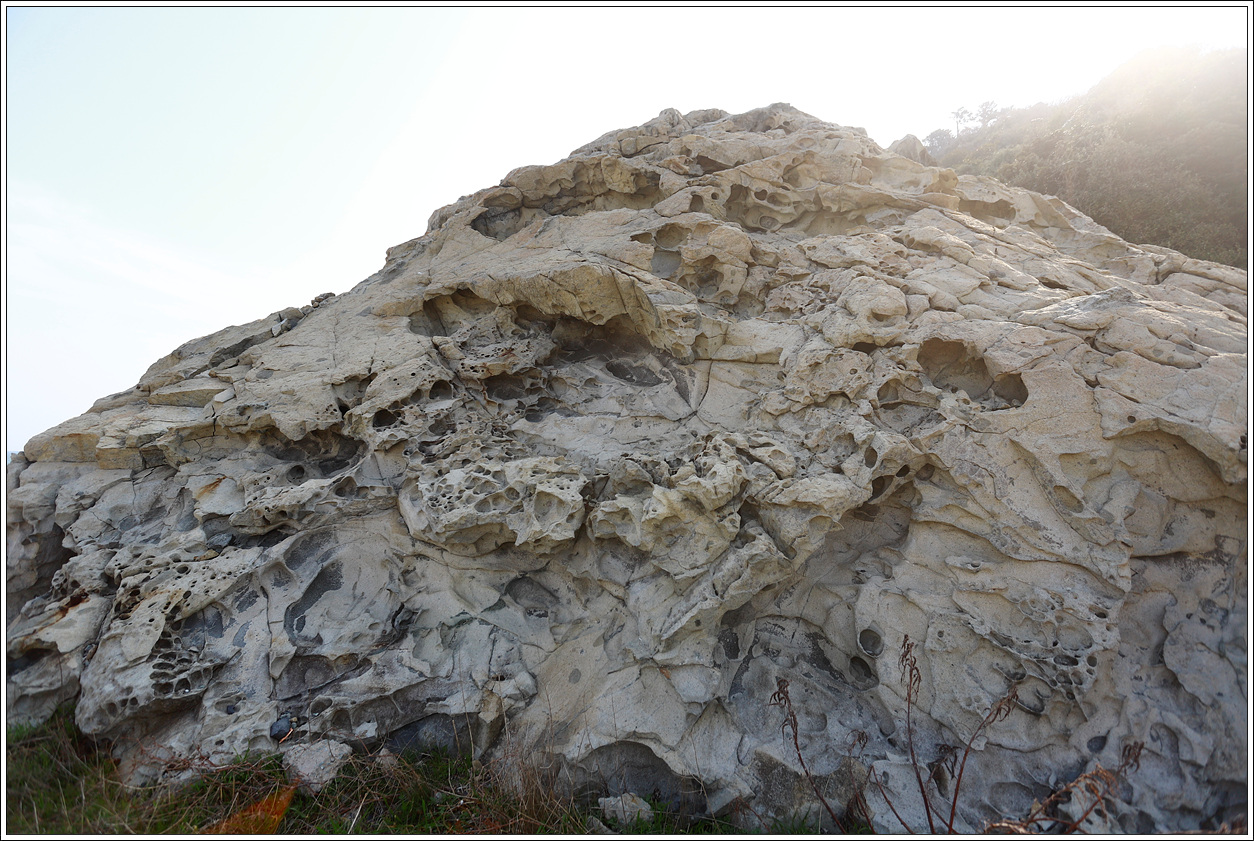 ▽ 통영의 수우도에서 본 해골바위가 생각나는 같은 종류로 보이는 암석이 방파제 초입에 있는데 이곳에서는 바구똥바위라 부르는 것 같다. 그러고 보니 그럴듯 해 보인다.