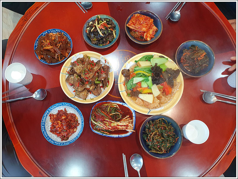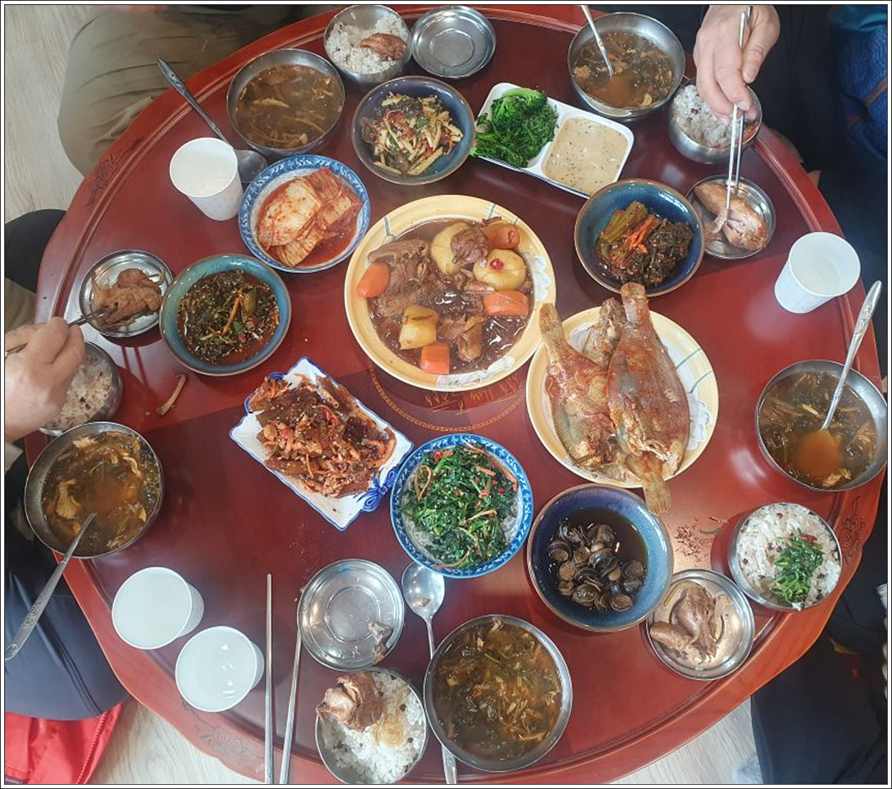 ▽ 점심식사 시간은 11:30분부터였는데 11시도 안되어 밥상에 앉아들 있으니 민박집 주인도 당황스러운 표정이다.