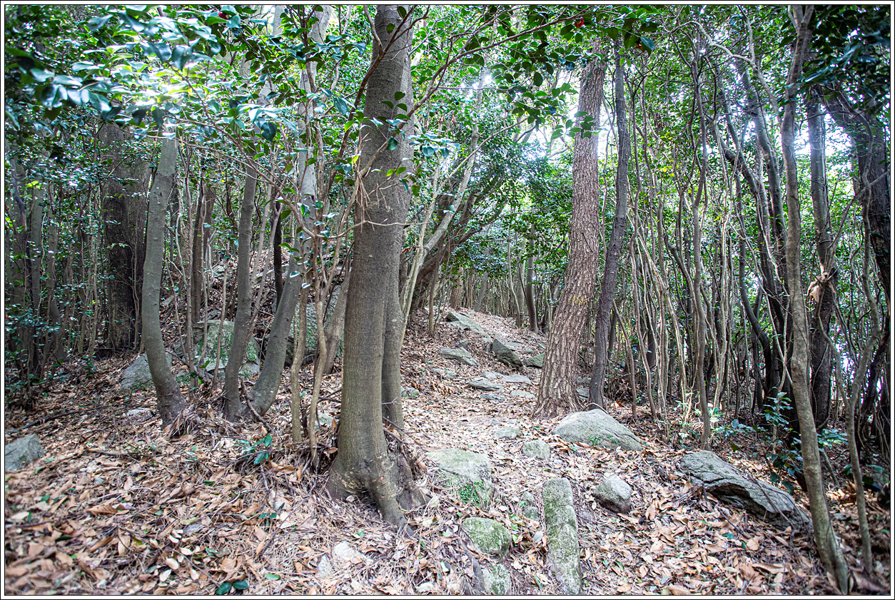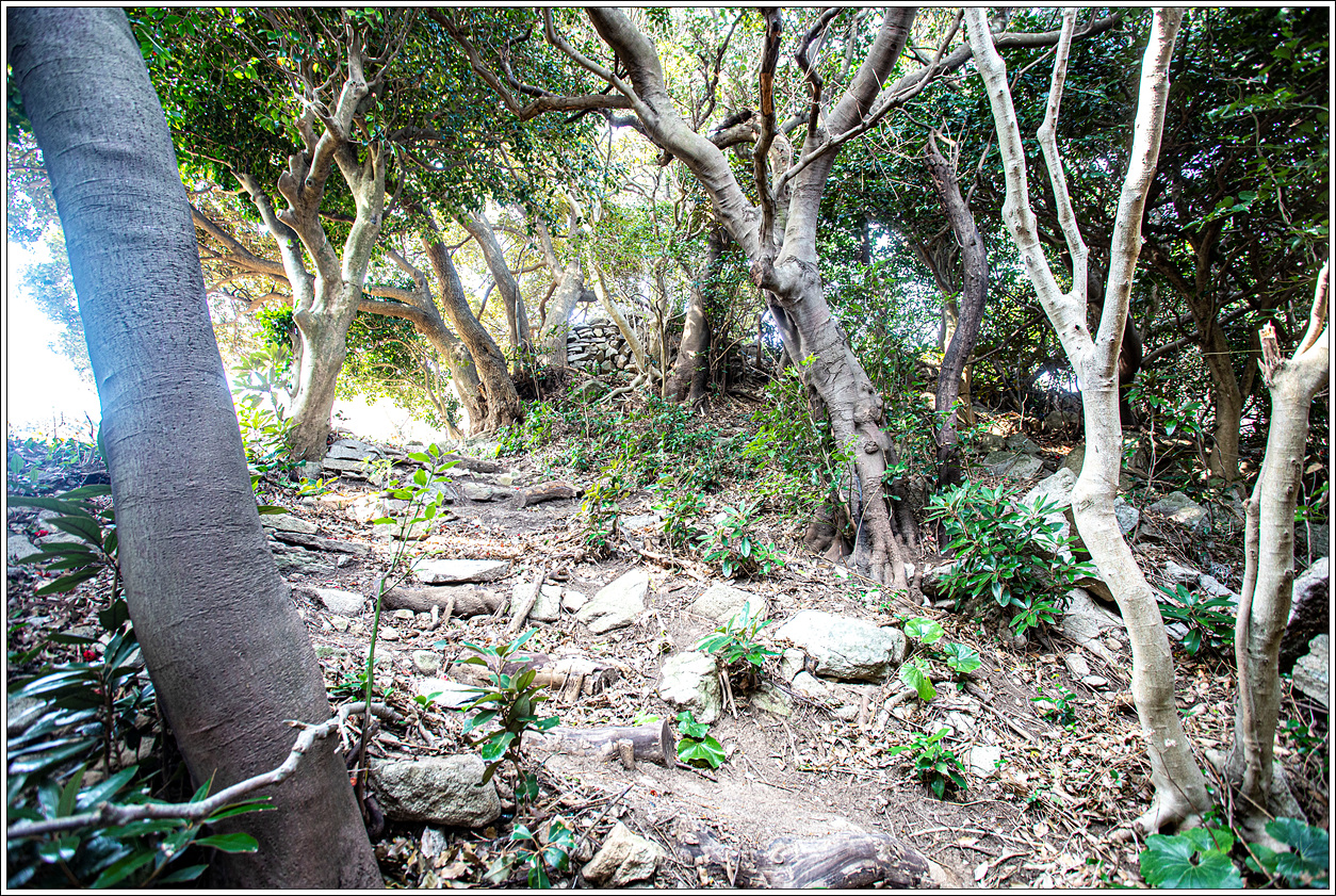 ▽ 동백나무와 후박나무 등 상록수가 우거진 길을 오르고...