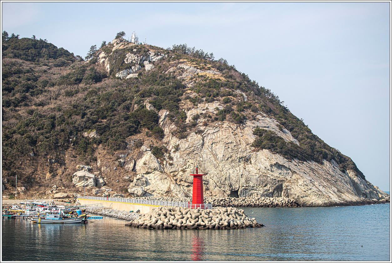 ▽ 여서항의 빨간등대와 산위의 무인등대가 마주하고 있는 풍경이다.
