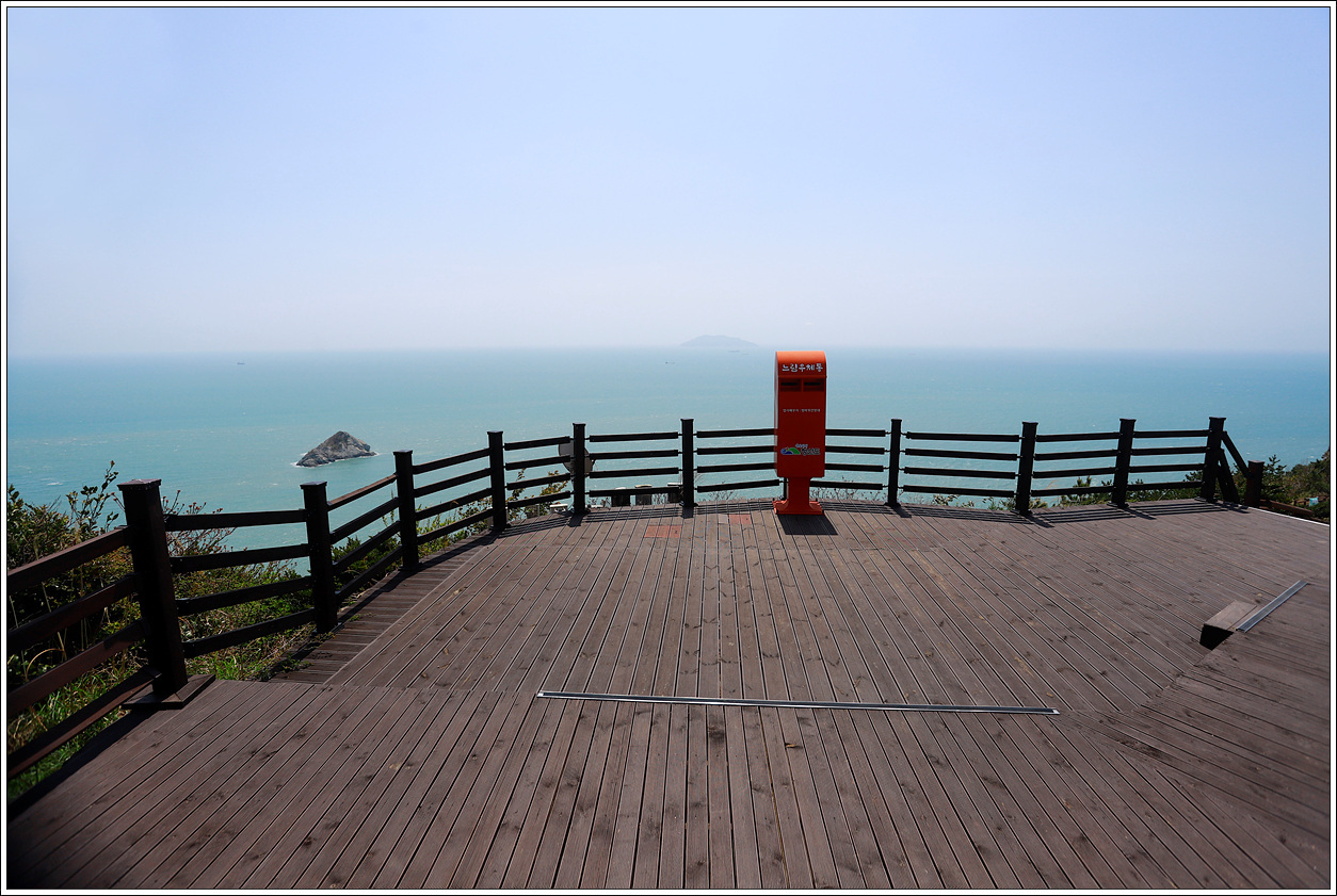 ▽ 2021년 4월 1일 청산도 범바위 전망데크에서 우체통 넘어로 바라봤던 흐릿하게 보이는 여서도의 풍경이다. 이곳 여서도에서 북쪽을 바라보면 청산도가 보여야 하지만 깨스층으로 인해 보이질 않는다.