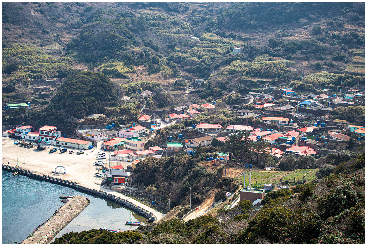 ▽ 여서도 마을 전경으로 이 섬의 집 지붕색은 지자체의 지원을 받아 주홍색으로 도색했는데 물탱크 만큼은 청색이어서 이색적으로 보인다.