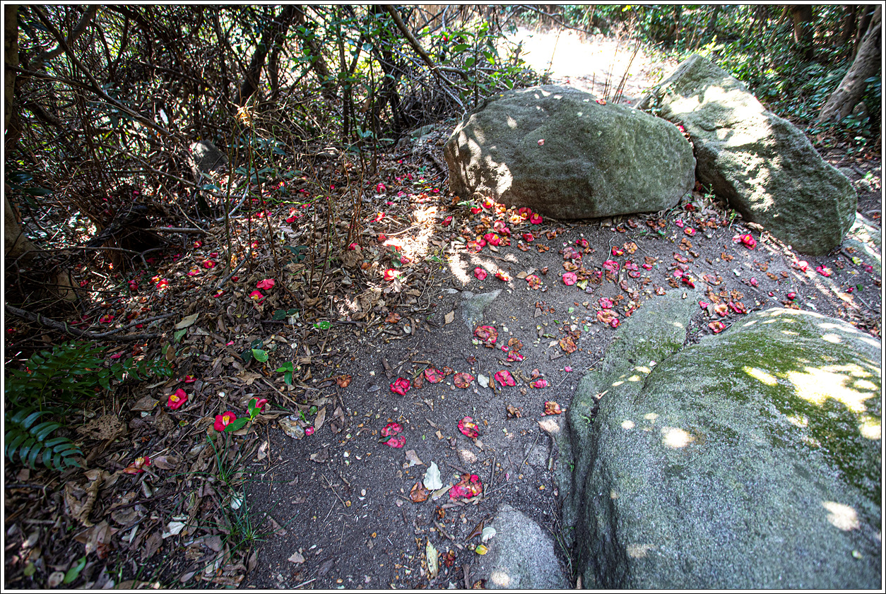 ▽ 사형제 바위를 지나면서도 계속 이어지는 동백나무 숲을 지나게 된다.
