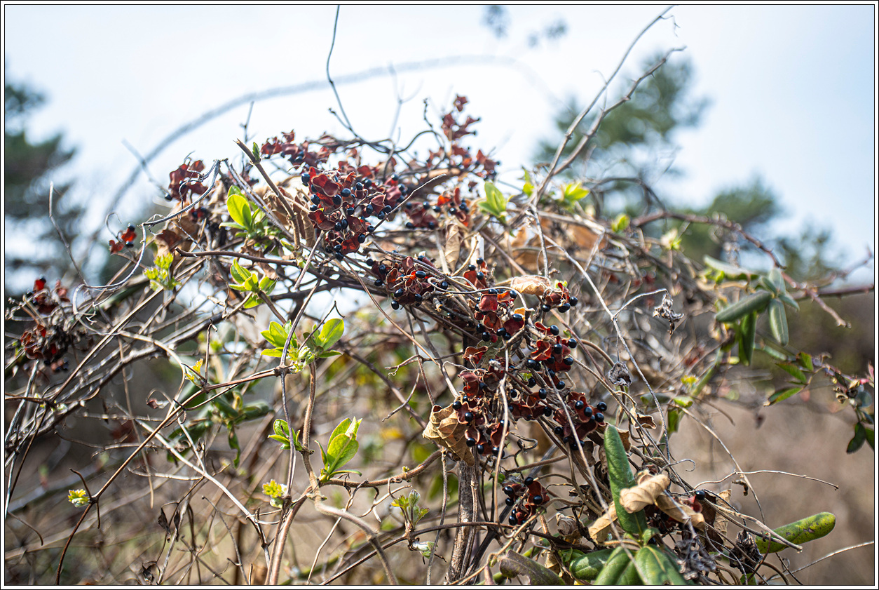▽ 이러한 열매도 새 순이 돋는 인동덩굴 사이에 있어 인동덩굴 열매로 얼핏 착각할 수도 있지만 역시 아랫녘에서 주로 볼 수 있는 여우콩 열매다. 이곳 여서도에서 특히 많이 보인다.