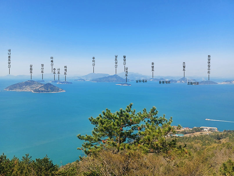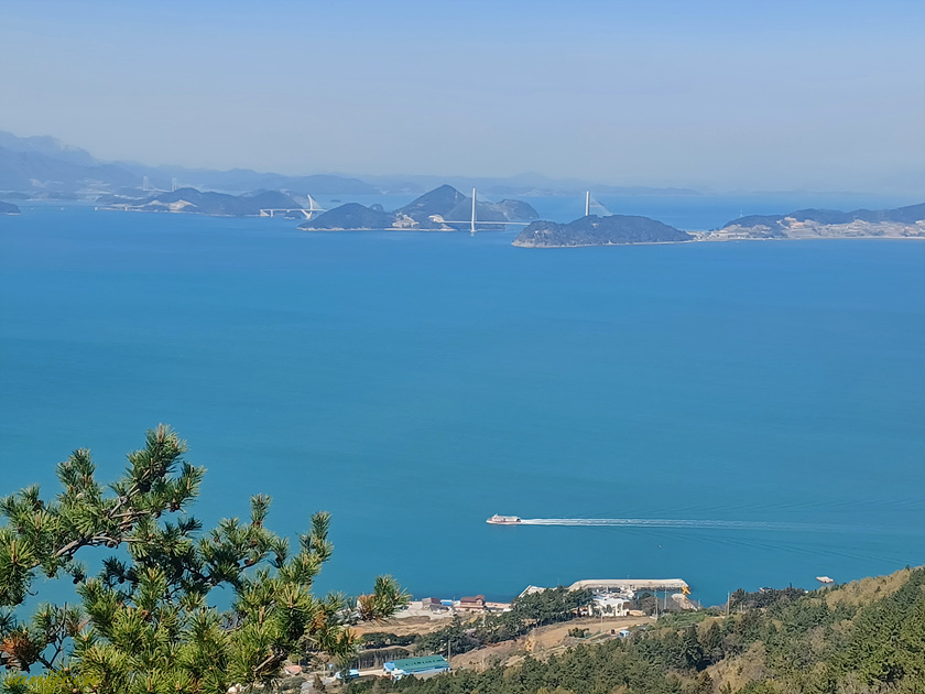 ▽ 아래 신기선착장이 보이고 왼쪽 멀리 고흥군과 여수의 적금도가 연결된 팔영대교를 비롯, 낭도대교, 둔병대교, 조발대교 순으로 보인다. 이 다리들은 과거 무박산행에서 산악회 버스가 새벽에 건넌 다리이기에 보지는 못했다.(사진출처:사니조은님 )