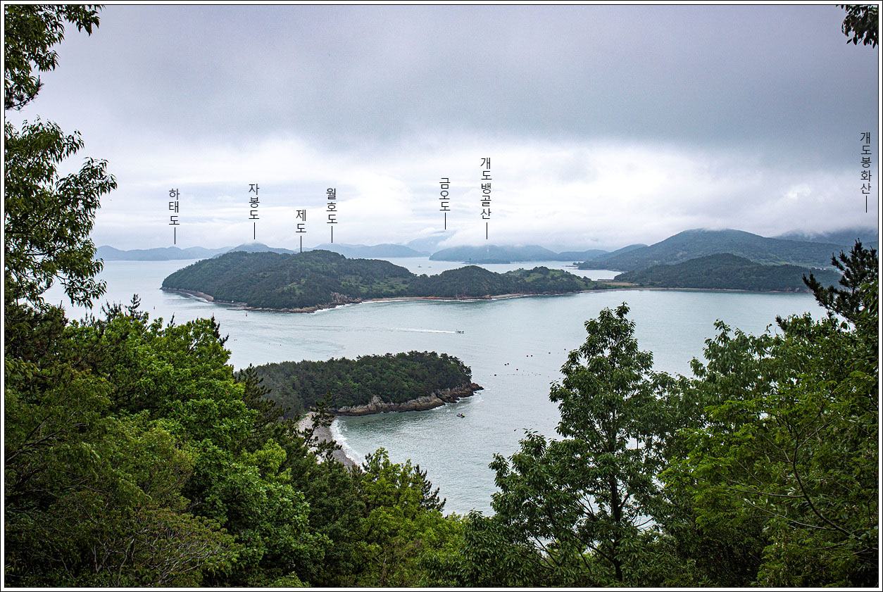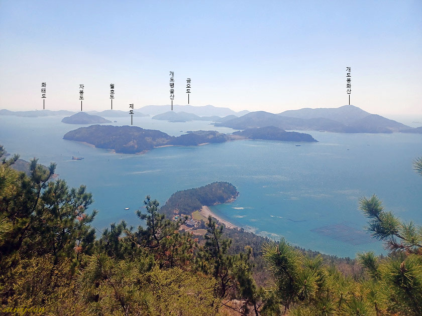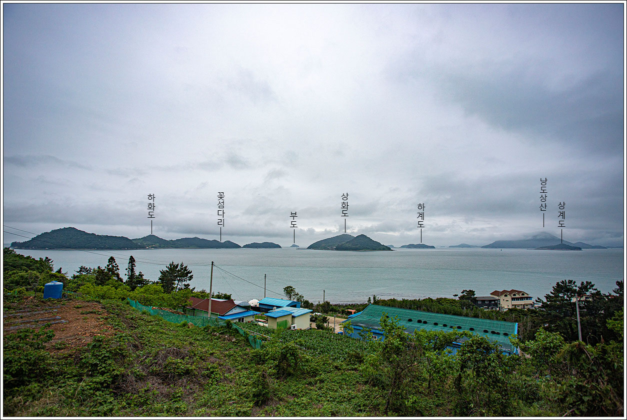 ▽ 맑은 날이면 이러한 풍경을 멋지게 즐겼을텐데 대신하여 블로거 사니조은님의 사진을 모셔왔고 지명은 갯버들이 기재했다. 남동쪽의 풍경으로 화태도로부터 개도의 봉화산까지 보인다. 100 섬에 포함된 금오도 대부산과 개도 봉화산은 이미 다녀 온 섬이다.