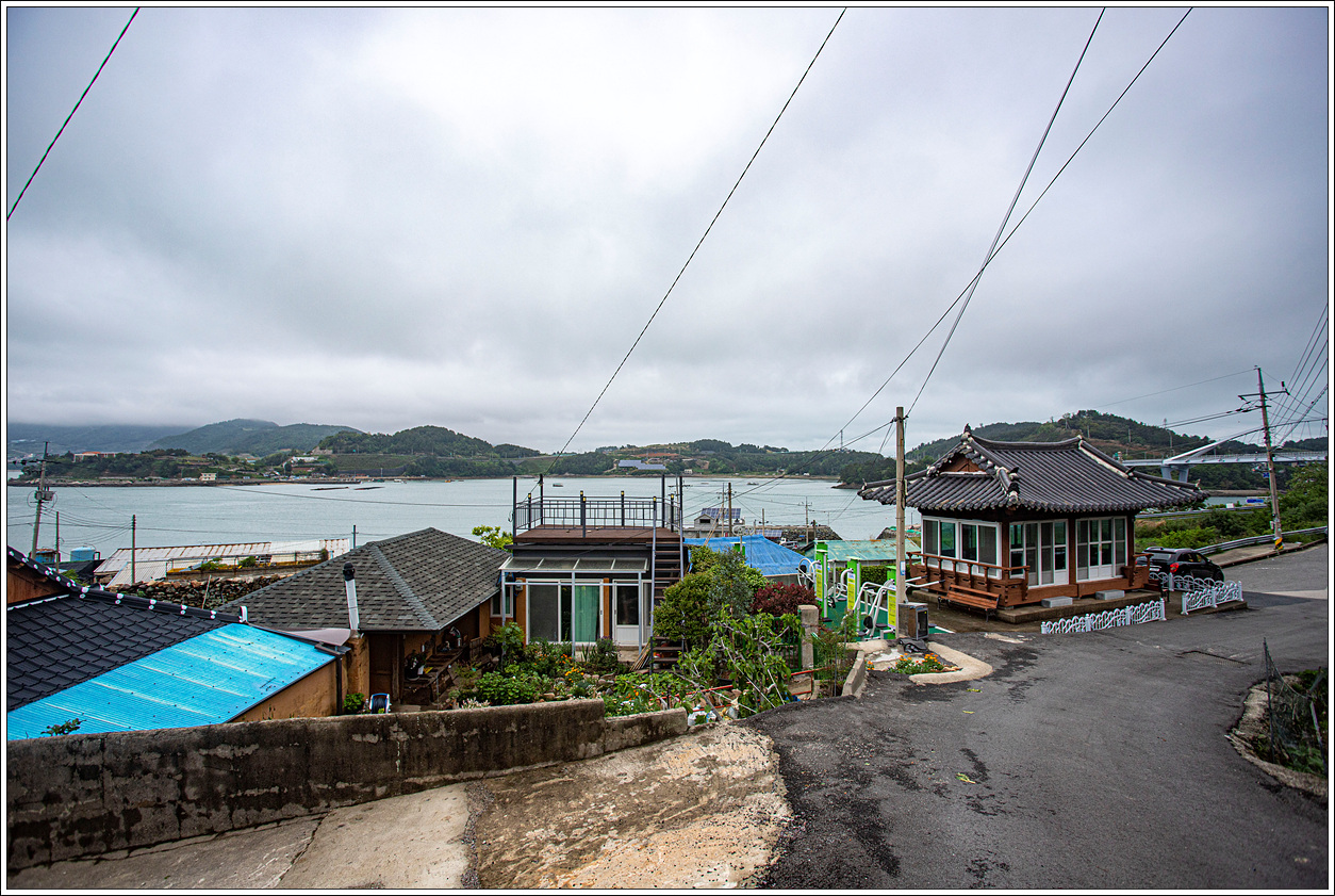 ▽ 왼쪽에 버스정류장과 승용차 1대가 세워져 있고 그 아래로 마을이 자리하고 있는 풍경, 멀리 돌산도의 구름층이 벗어날 기미가 없어 보인다.