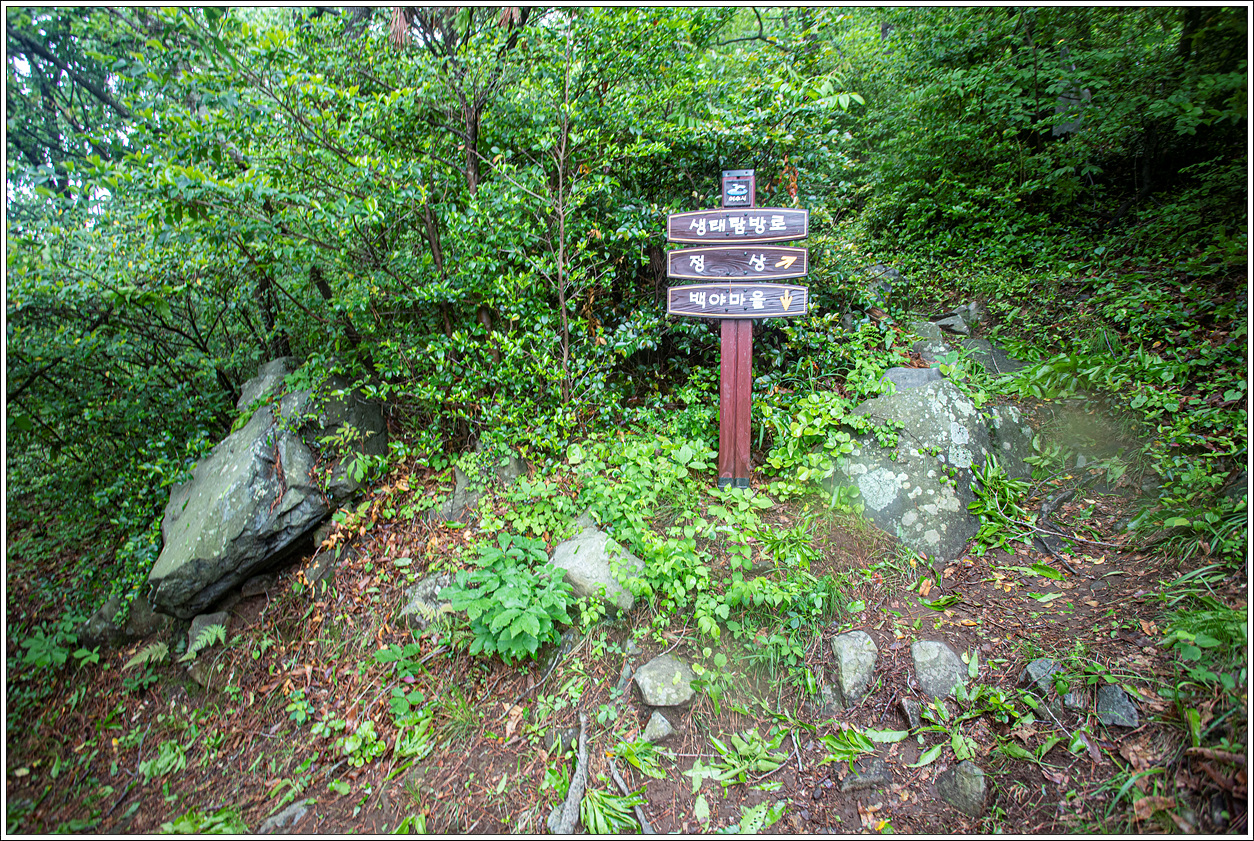 ▽ 하산하면서 이와같이 갈림길 삼거리가 나오는데 원점회귀지인 남쪽 방향의 백야마을로 가질 않고 북쪽 방향인 생태탐방로로 우틀하기로 한다.