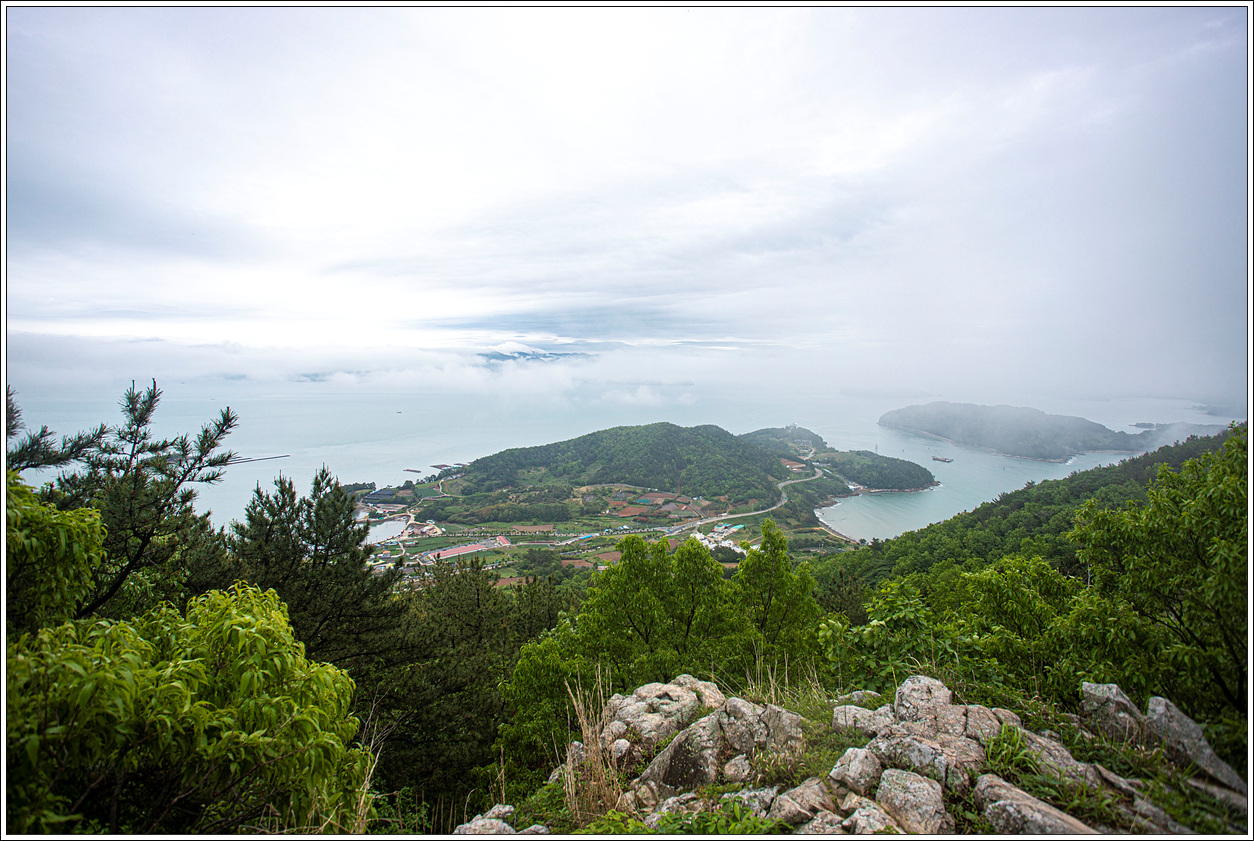 ▽ 계단위에서 남쪽 방향을 조망해 보는데 왼쪽의 돌산도는 구름에 완전히 가렸고 오른쪽 앞의 제도와 그 뒤로 개도가 역시 구름에 가려져 있다.