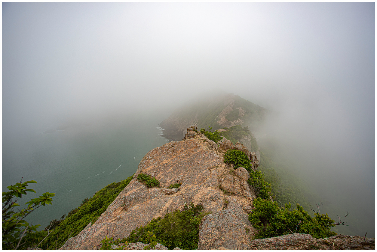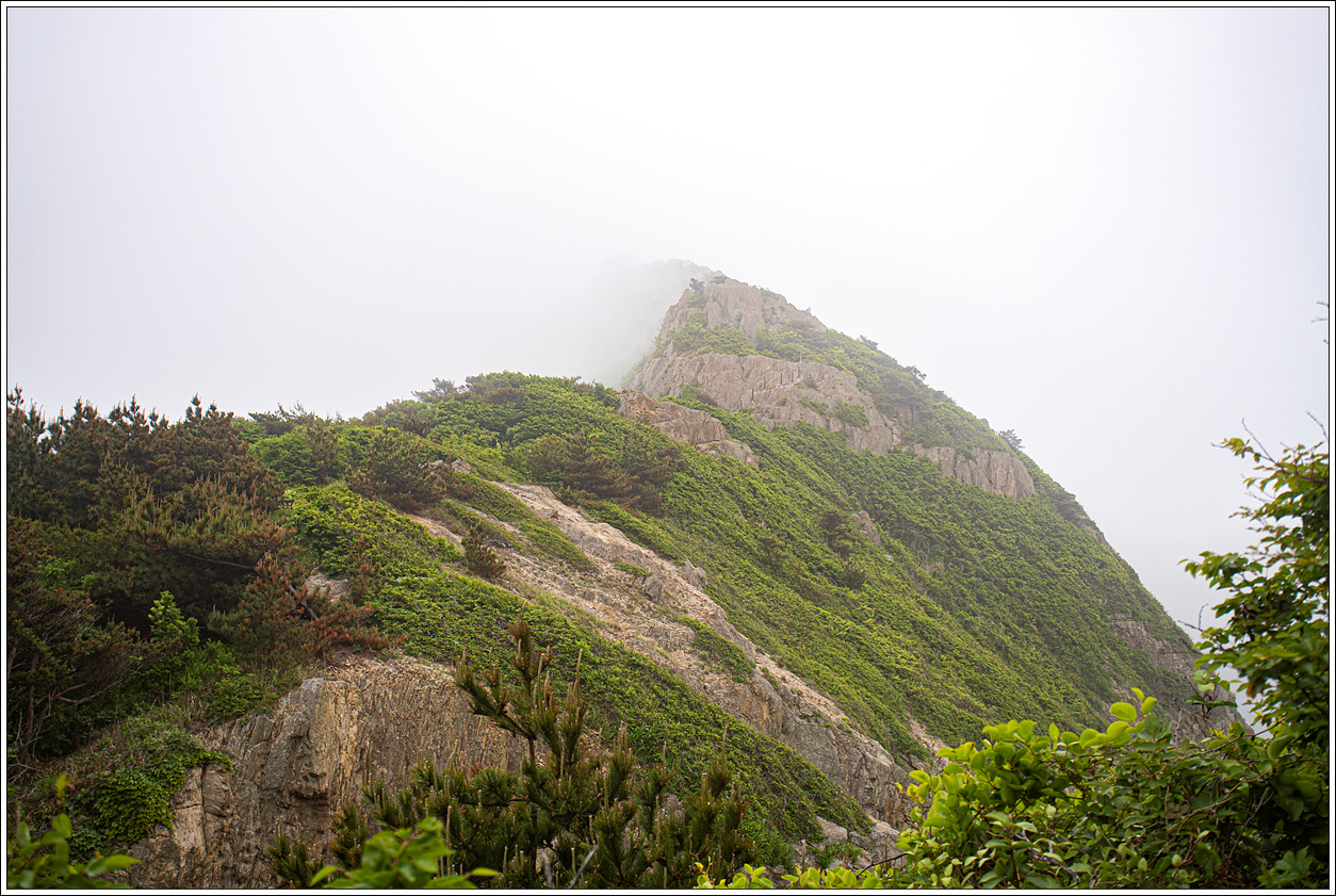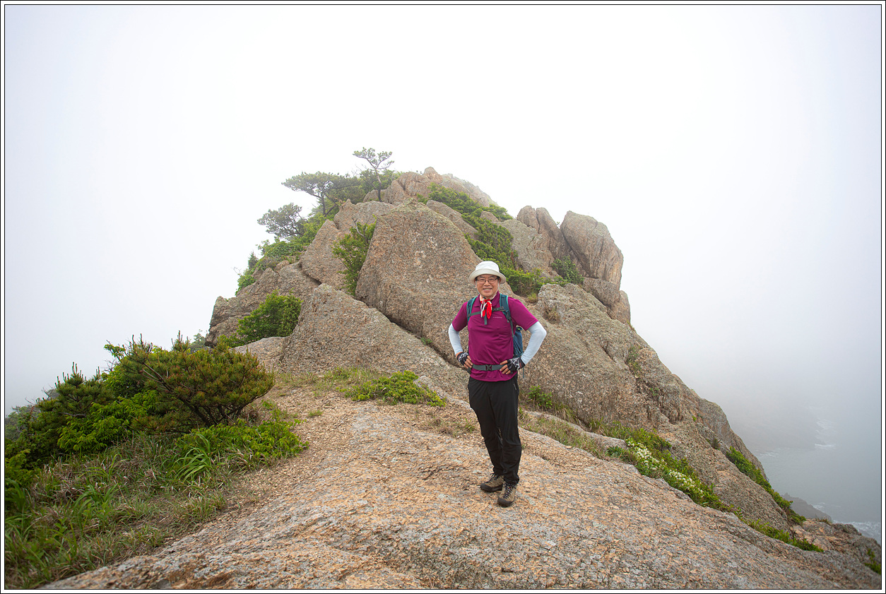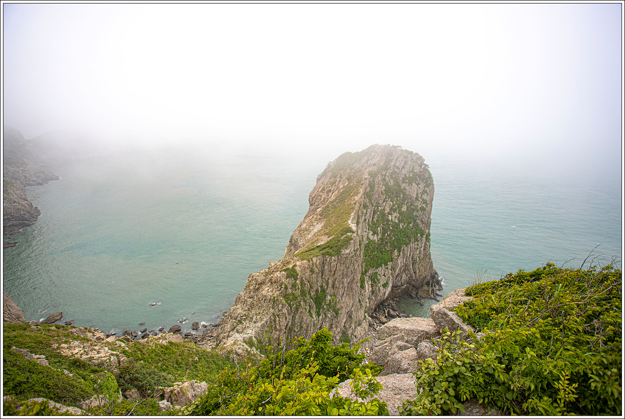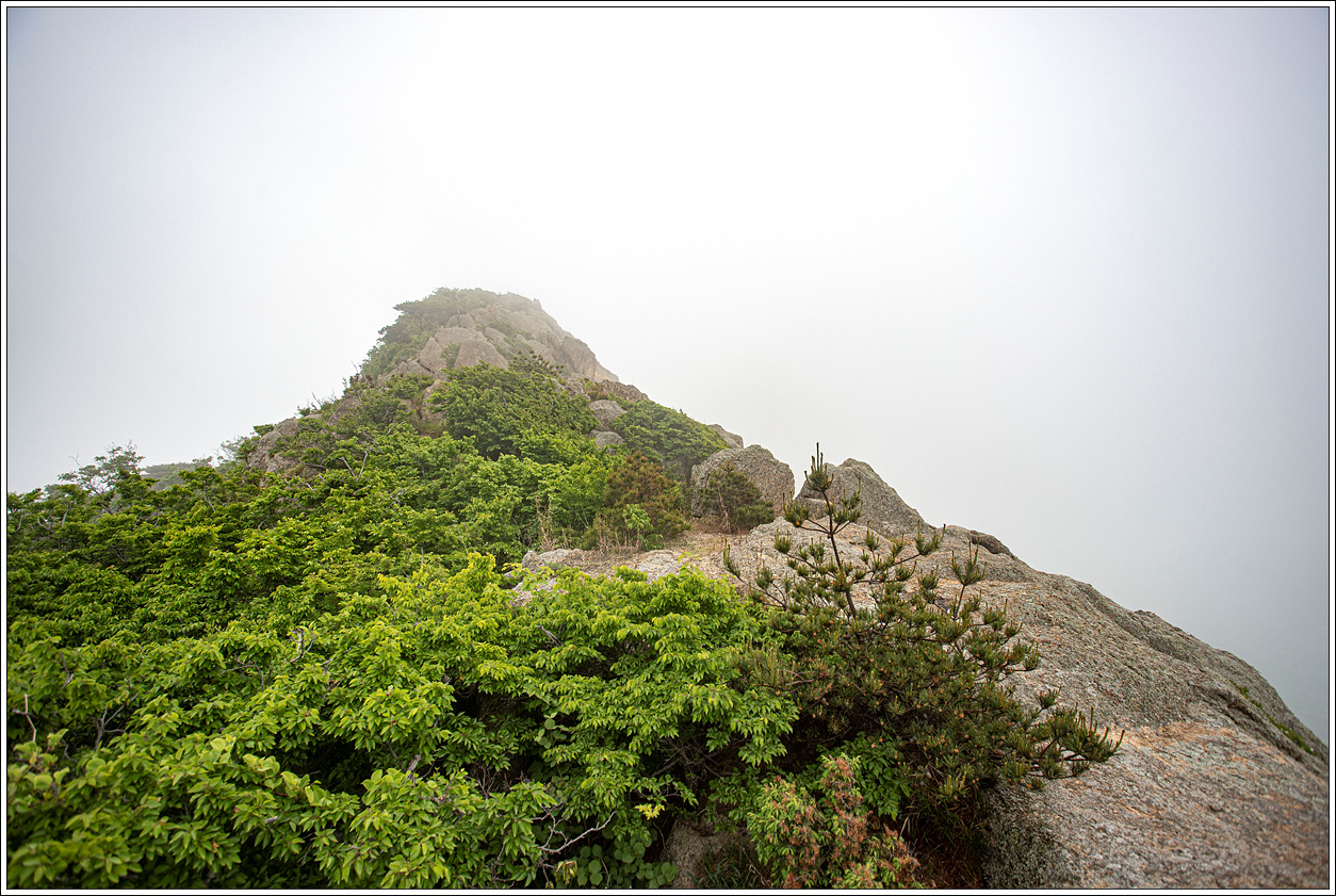▽ 농바위를 포함, 왼쪽 송신탑이 있는 정상과 해변으로 이어진 절경이 안개에 가려 반쪽자리 풍경이 되어 버렸다. 근거리의 풍경은 문제가 없으나 먼거리는 조망 제로다.