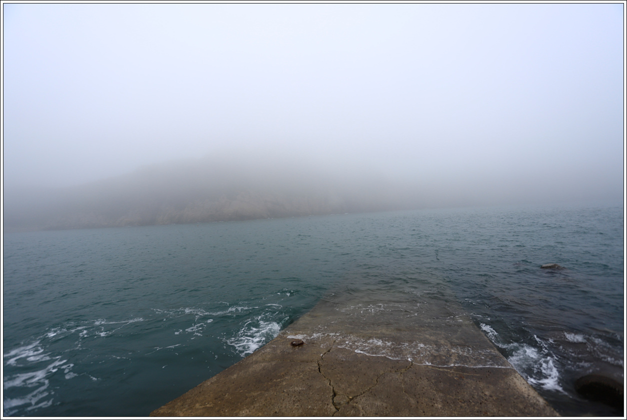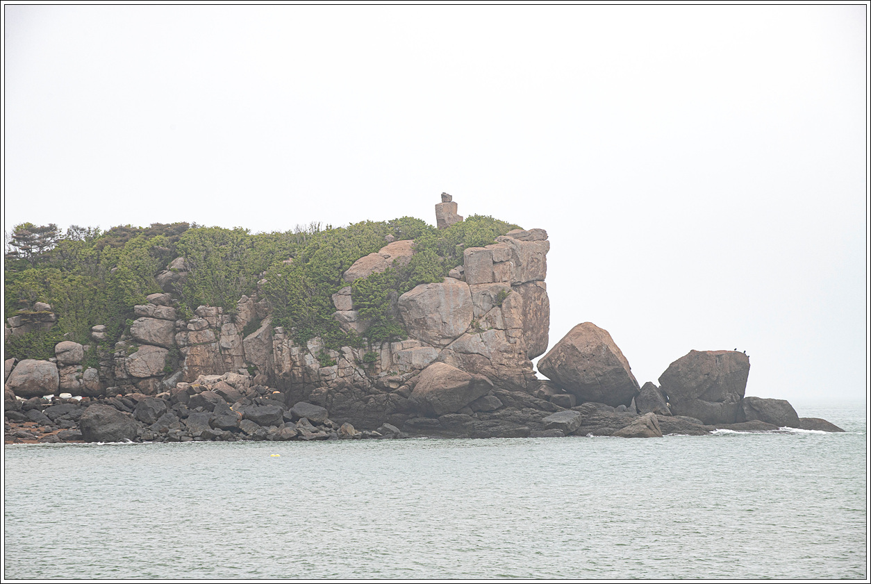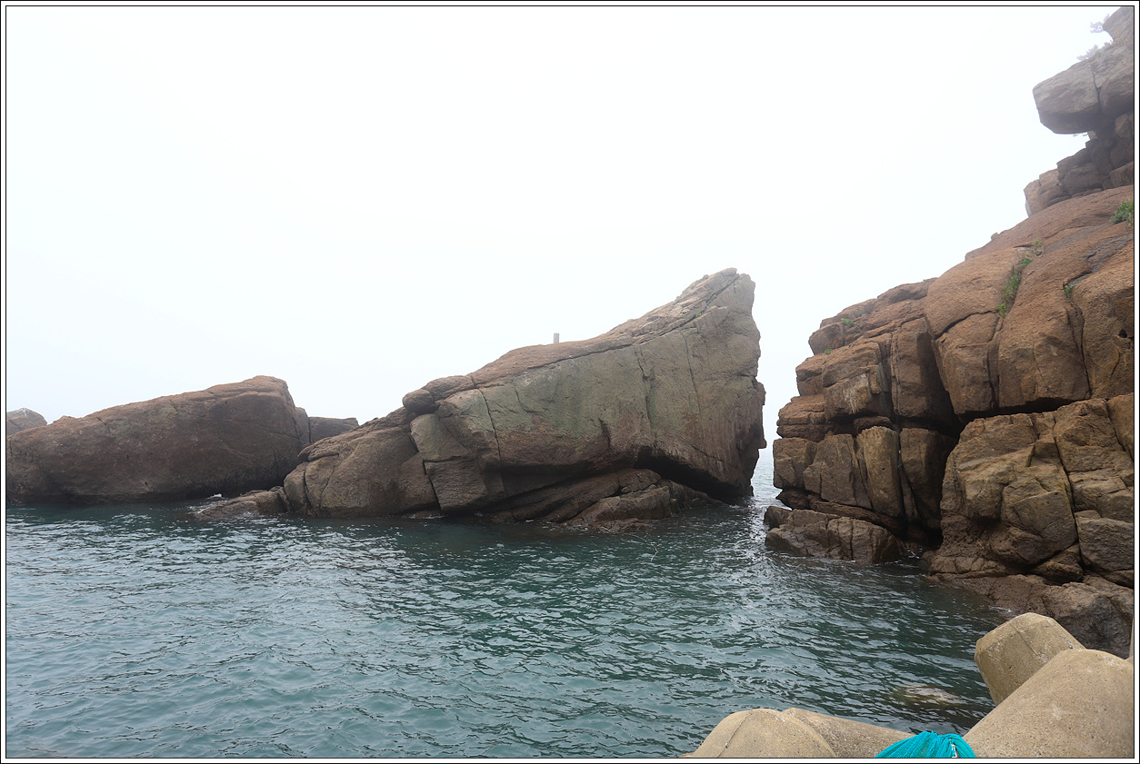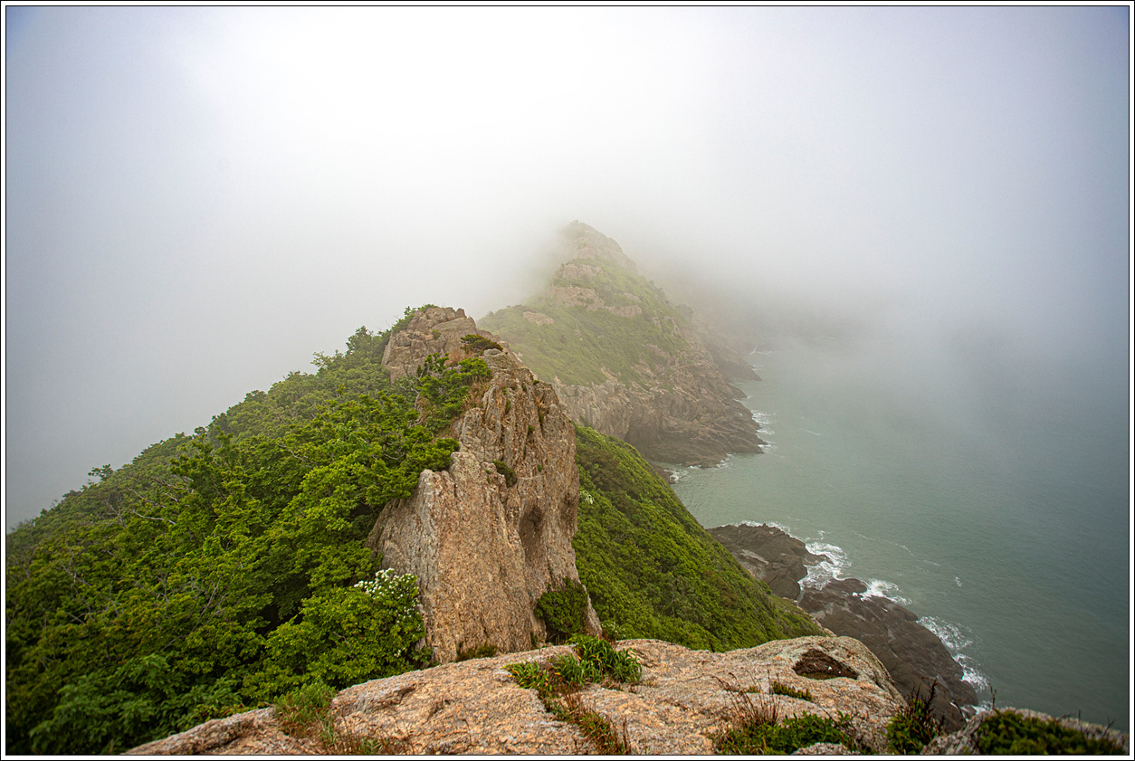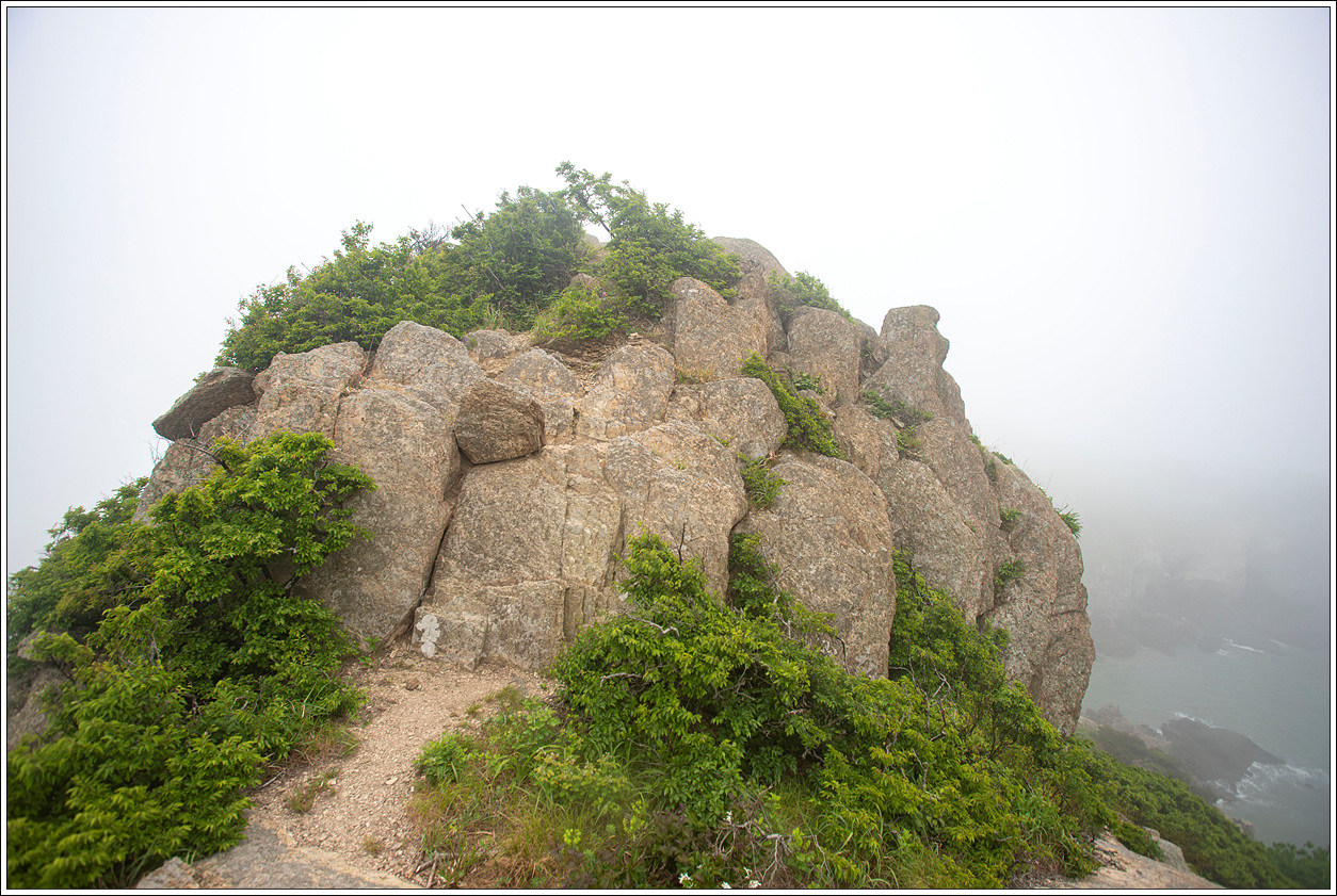 ▽ 농바위를 포함, 왼쪽 송신탑이 있는 정상과 해변으로 이어진 절경이 안개에 가려 반쪽자리 풍경이 되어 버렸다. 근거리의 풍경은 문제가 없으나 먼거리는 조망 제로다.