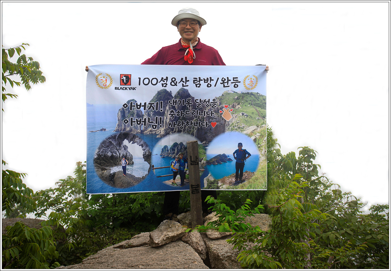 ▽ 아들, 며느리가 만들어 축하 플랭카드를 만들어 주어 인증을 하면서 드디어 100섬 탐방 및 산행 완등에 실감이 난다. 애들에게 고맙고 사랑한다는 말을 전한다.