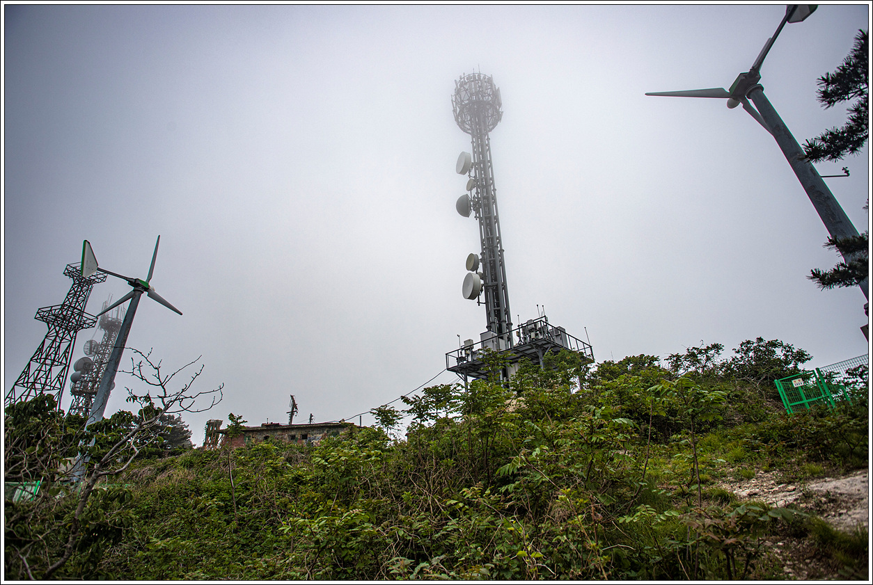 ▽ 송신탑이 있는 정상에 도착했다. 바람도 세다보니 풍력발전기 돌아가는 소리가 위협적이다.