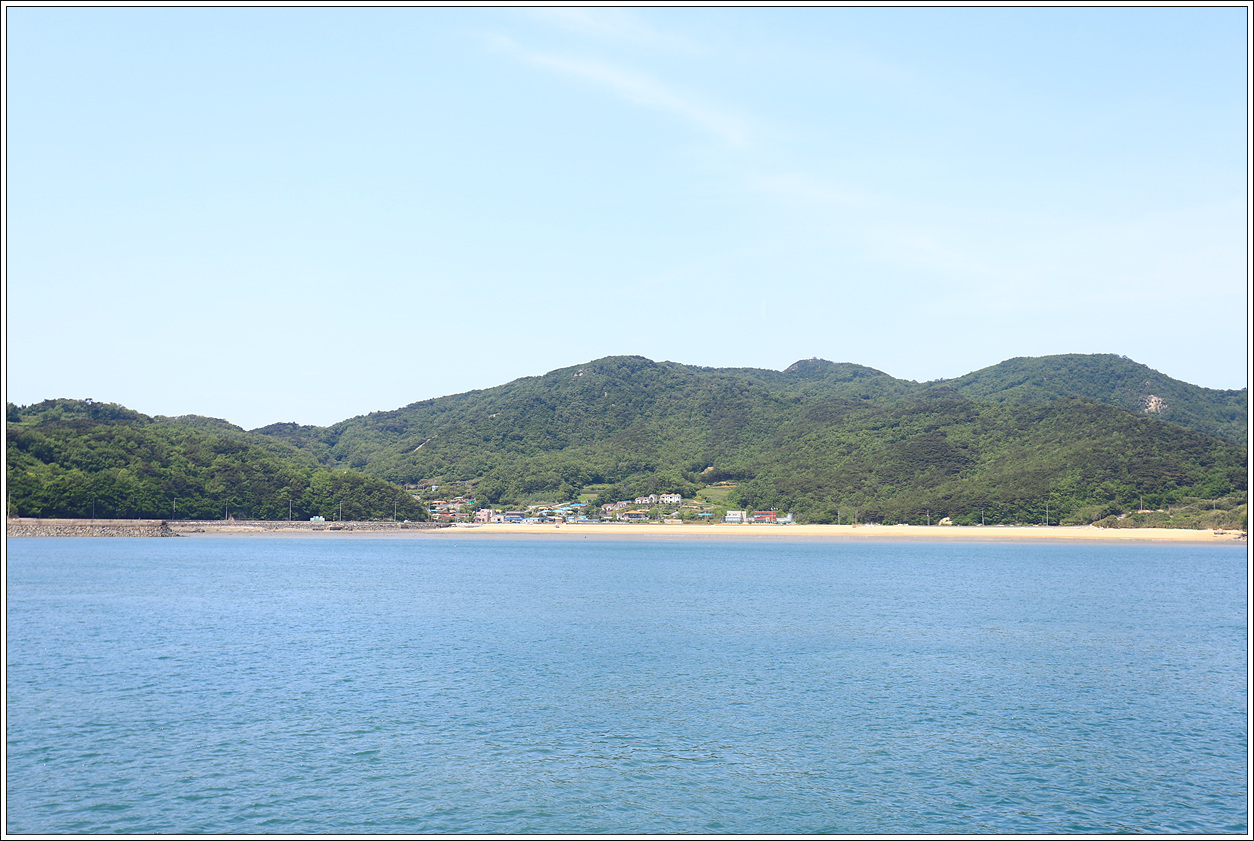 ▽ 작년 8월 18일 당일치기로 이 배를 타고 갔다가 돌아오는 2시간 동안 잠시 올라 아쉬움을 남긴 문갑도의 깃대봉과 마을이다.