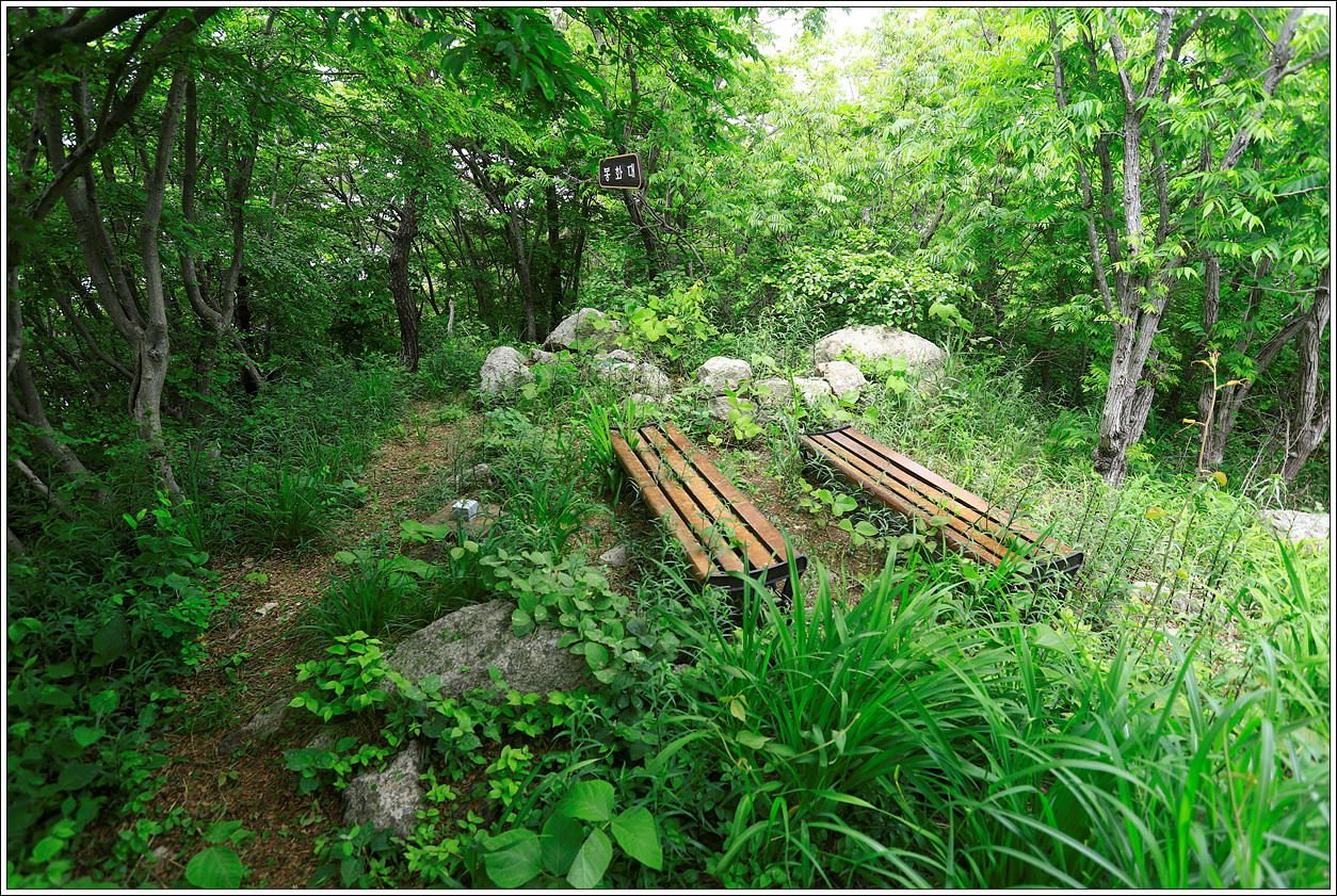 ▽ 봉화대에 도착, 벤취가 두개 놓여져 있다. 봉화대자리라는 것을 짐작케 할 돌무더기가 보이고 벤취 왼쪽에 삼각점이 놓여있다.