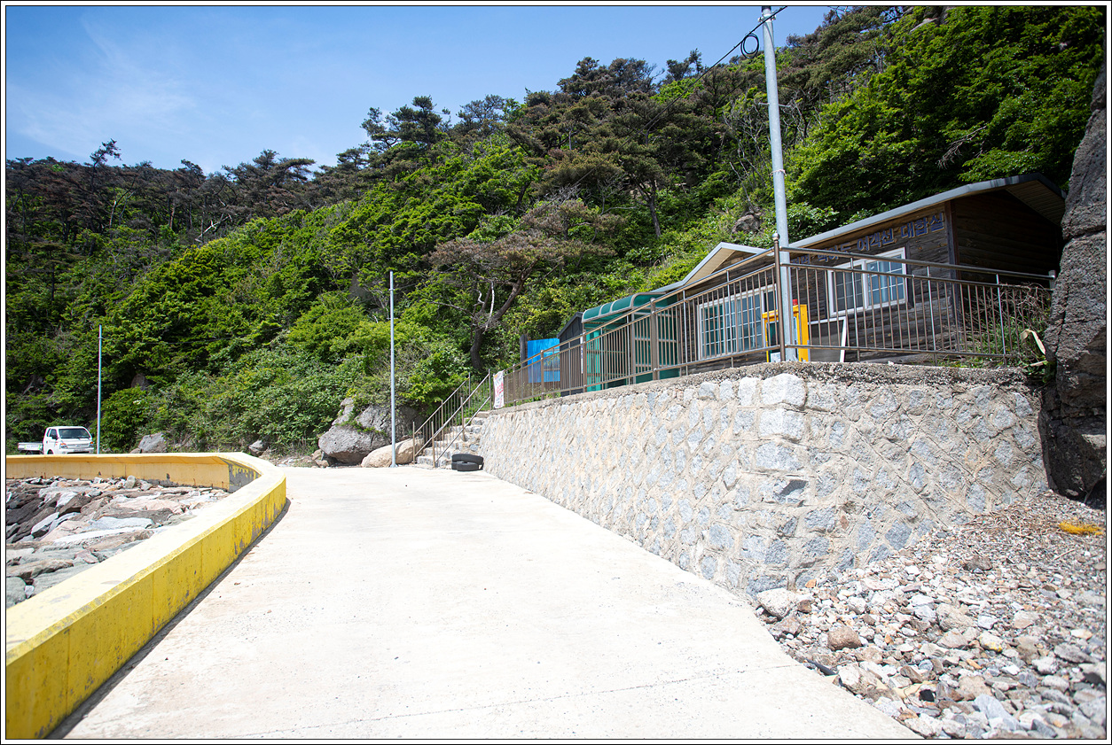 ▽ 택배보관소와 여객선대합실이 있는 건물 끝자락 오른쪽 계단이 산행 들머리가 된다.