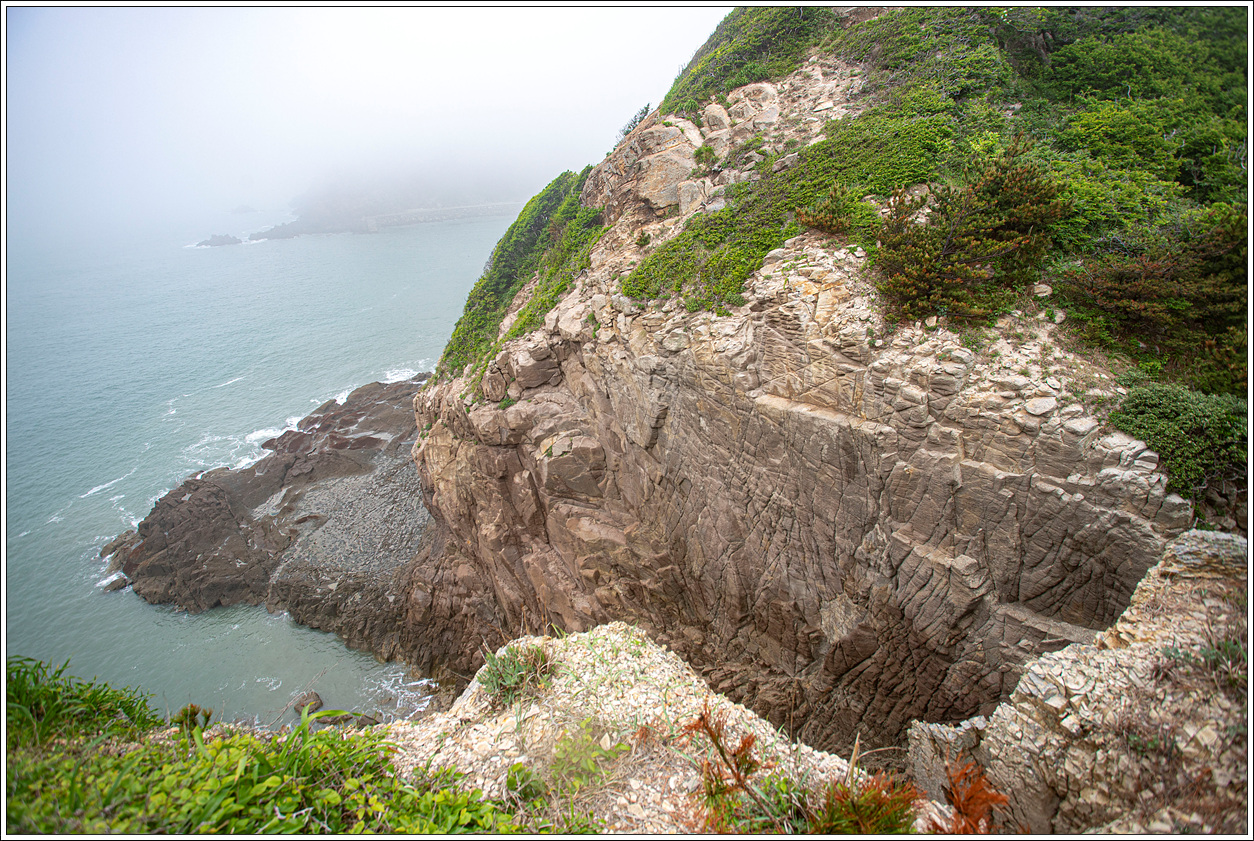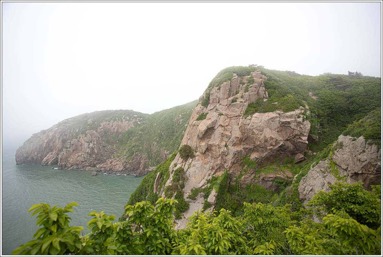 ▽ 뒤돌아 본 왼쪽 농바위와 해안 절경으로 조망대는 안개에 가려 보이질 않는다.