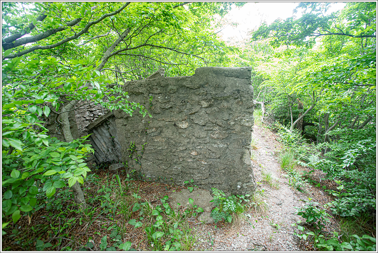▽ 당산방향으로 이동을 하다보니 작은 폐건축물이 보이는데 무슨 용도의 건물이었는지 창이 나 있질 않은 것으로 봐서 군사용으로 쓰였던 건물로 추측이 된다.
