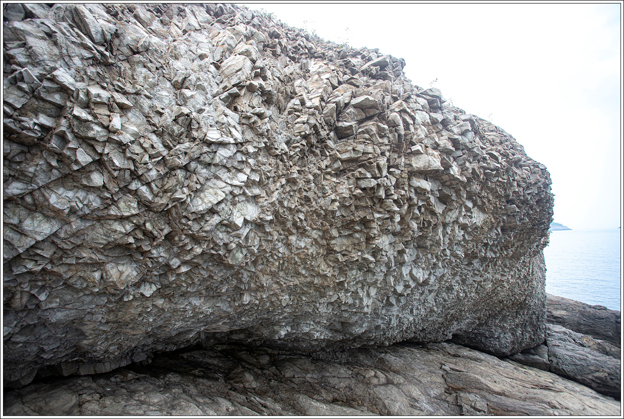 ▽ 해안에 이르자 이런 바위가... 이것이 번쩍번쩍 빛나는 수정체라면, 그것도 자수정이라면 얼마나 멋있을까, 상상은 자유라는데...그러나 공복이어서인지 해삼이 생각나면서 비응항에 가면 자유 매식이 있다는데 해삼을 먹어야겠다는 생각으로 금방 바뀐다.