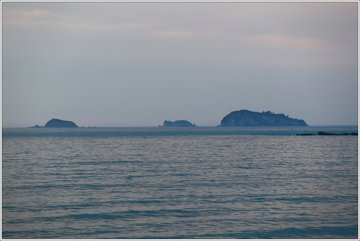 ▽ 왼쪽의 작은 섬은 대뱅이, 가운데 멀리 등대가 있는 거먹뱅이, 아스라이 보이는 섬이 옹진군의 선갑도이고 오른쪽 섬은 소분점도이다.