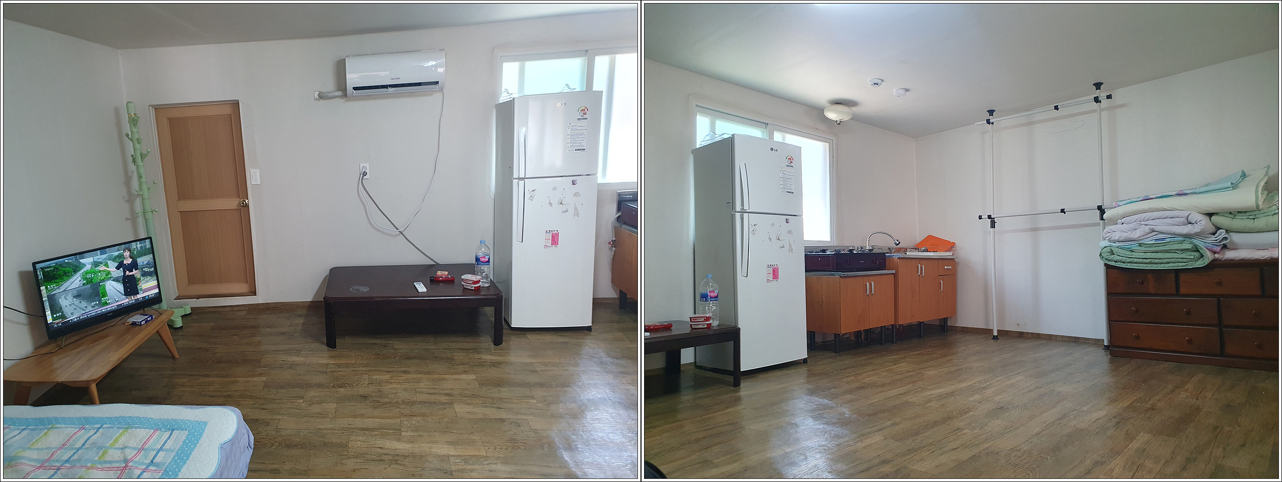 ▽ 방은 남, 녀 각각 한 개씩만 써도 널널하다. 방에도 주방시설이 되어 있으니 안마당의 주방기구는 냉장고외에는 쓸 일이 없다.