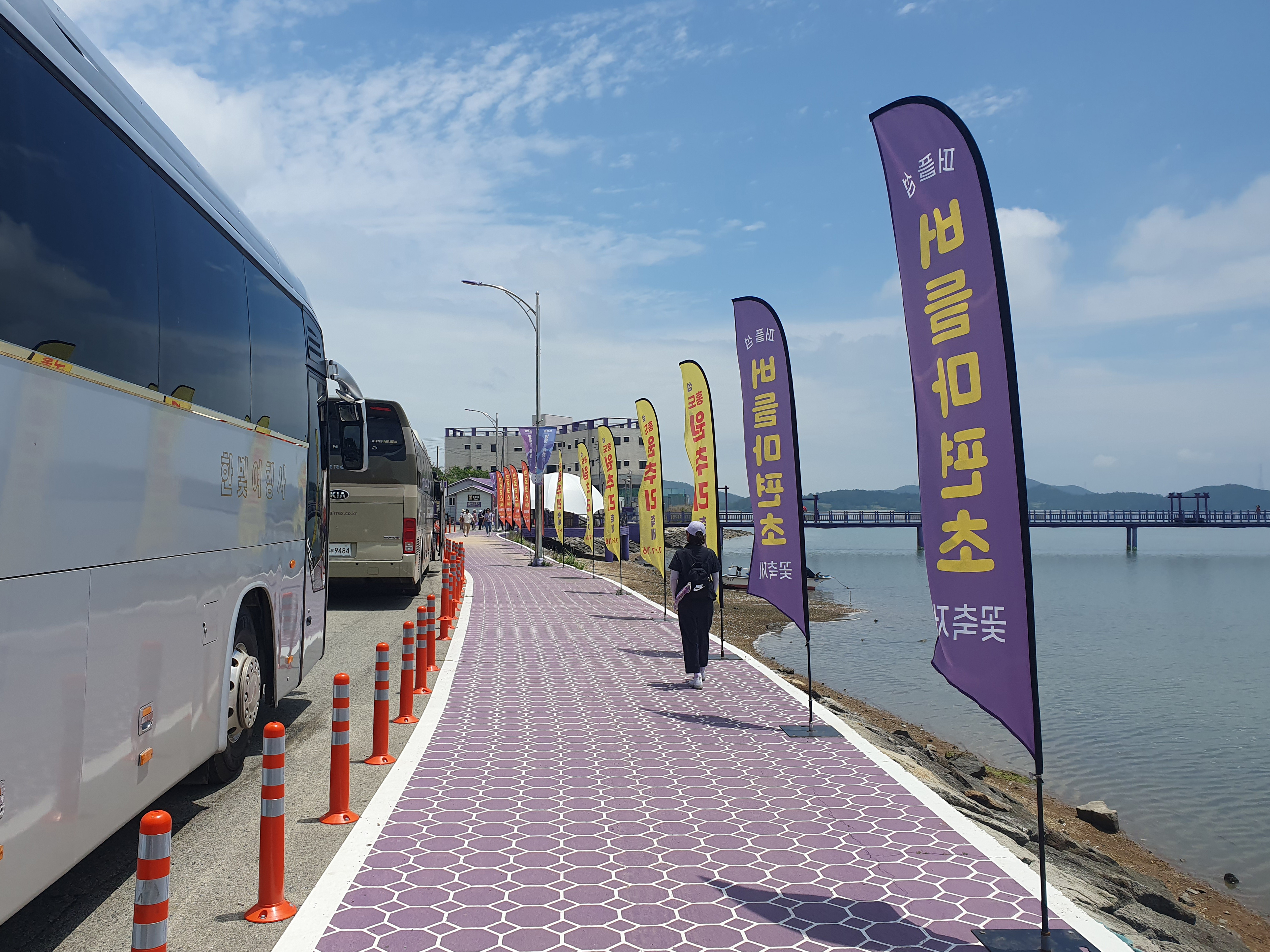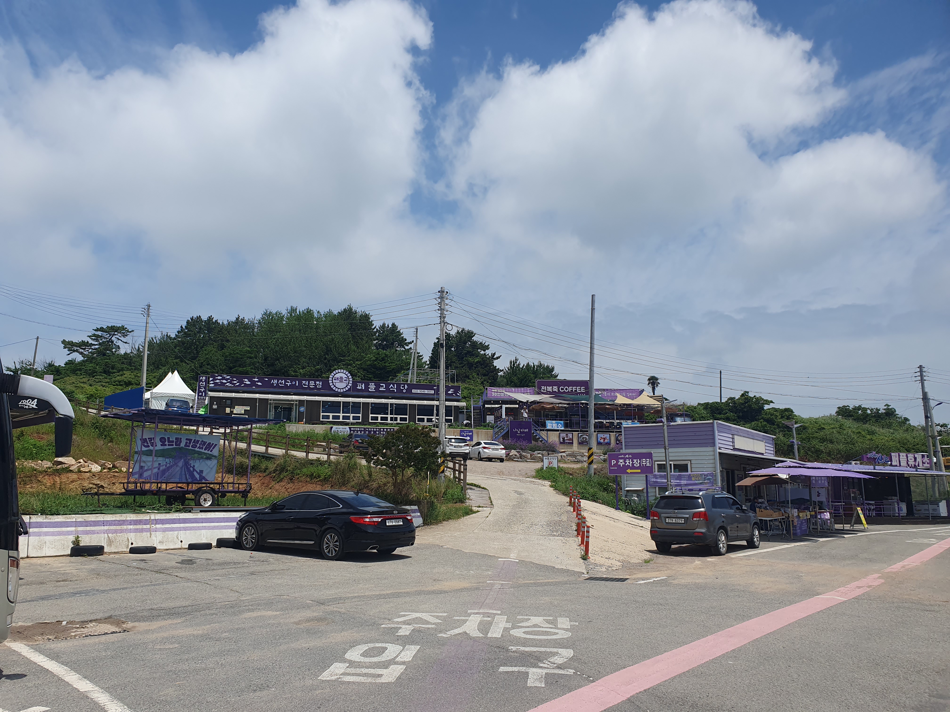 ▽ 한 여름에 핀 큰금계국 꽃도 좋을 것 같고 가을에 코스모스 꽃이 피어도 좋을 듯한 산책로이다. 그러나 퍼플섬이란 이름답게 만개한 보라색 꽃이 몽환적인 분위기를 자아낸다. 해안산책로는 자전거를 대여하거나 이용 요금이 3,000원인 관광퍼플카(전동차)를 이용할 수 있는데 오늘은 전동차 운행하는 것은 몇 번 봤지만 자전거를 타는 관광객은 보질 못했다.